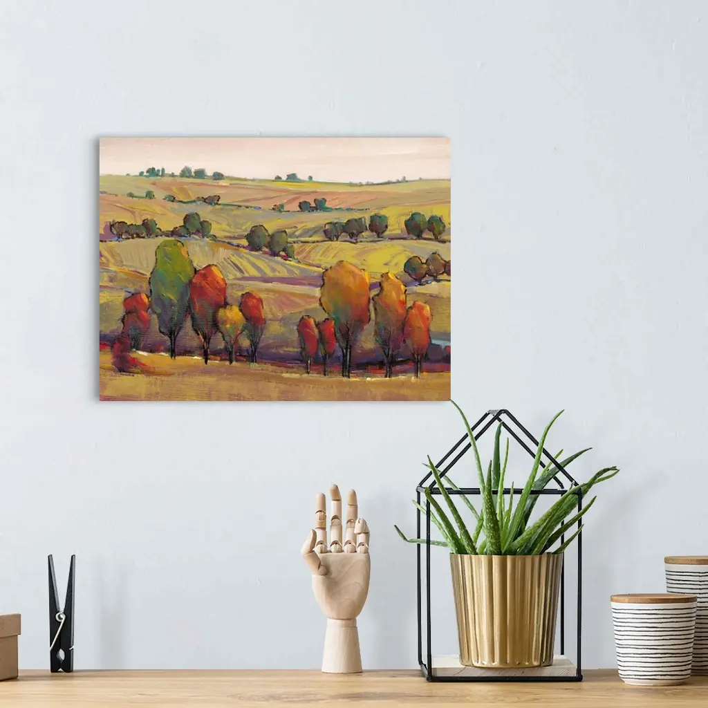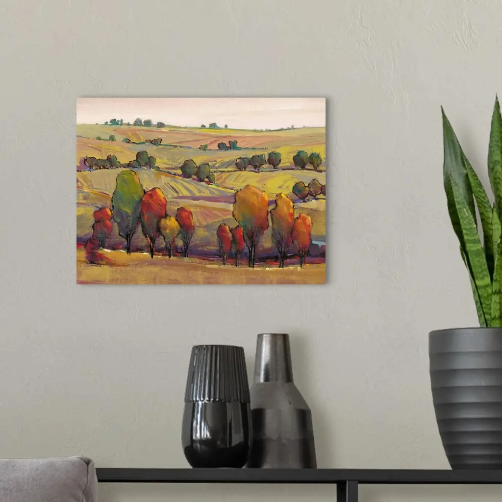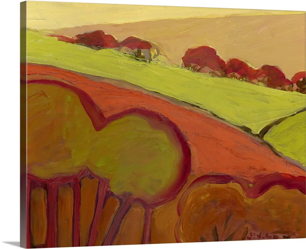 A painting using dark muted tones of a serene landscape with rolling hills.