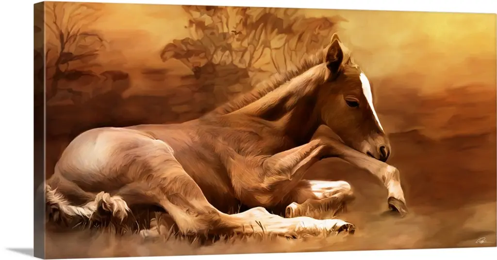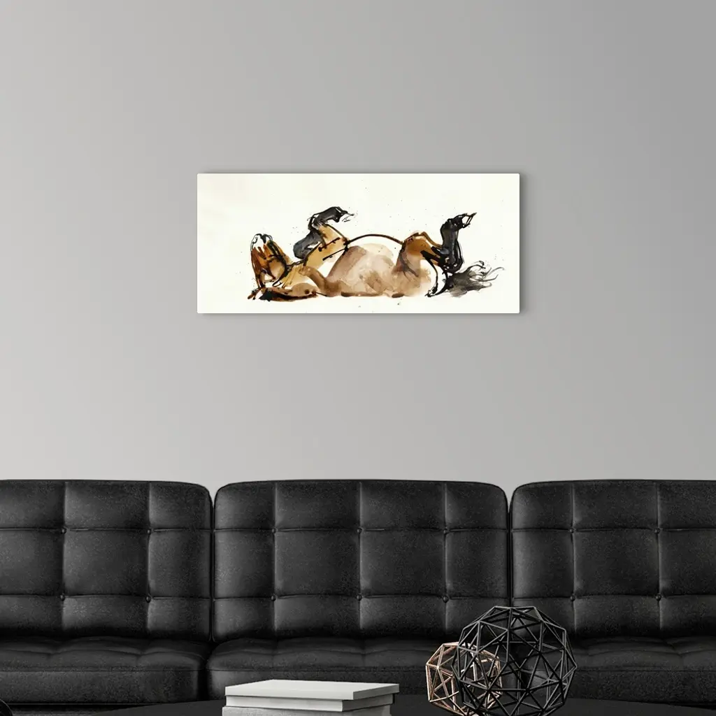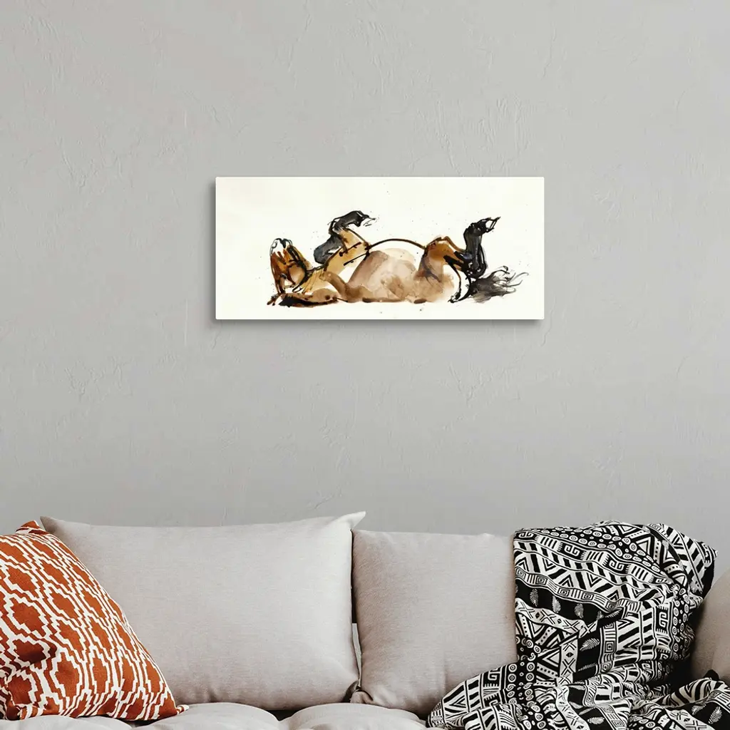 Contemporary painting of a Mongolian Przewalski horse rolling around on its back against a white background.