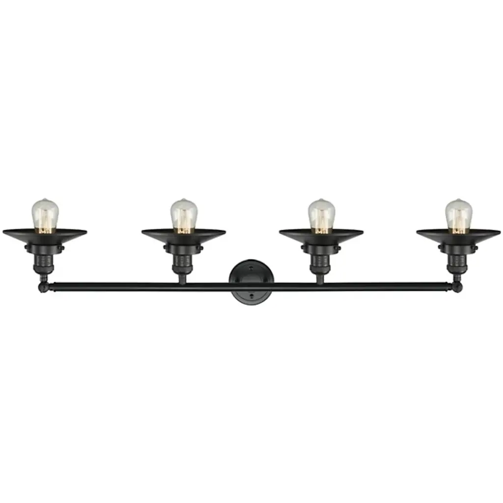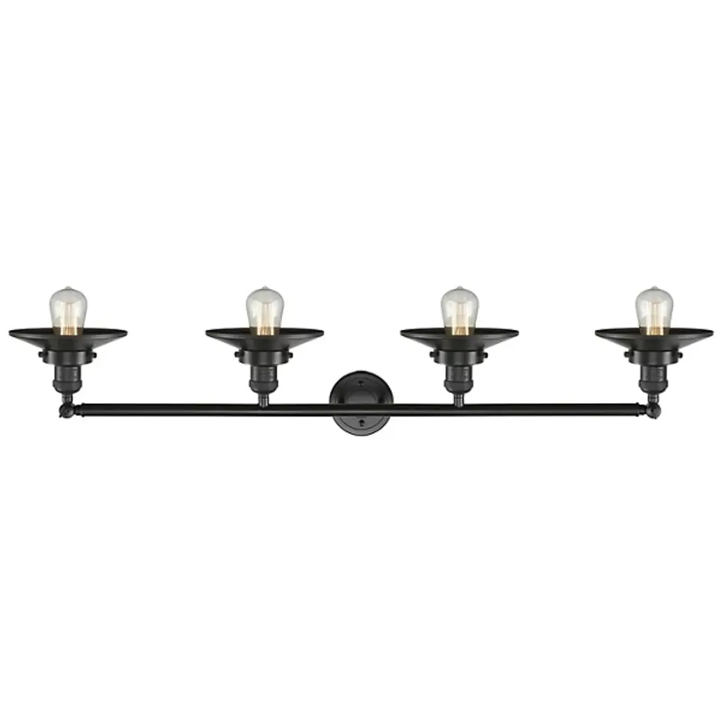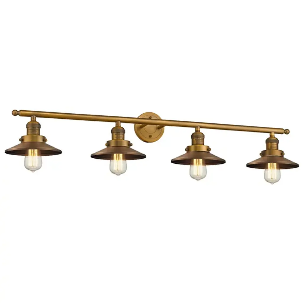 Bring light to your bathroom and beyond with the stylish lines of the Roman Vanity Light by Alder & Ore. A clean contemporary creation from the mind of Bruno Marashlian, it uses a single disc-shaped wall mount and two short stems to support a horizontal rod with a finial at each end that extends four evenly-spaced sockets. Each socket is damp-listed with a metal housing that matches its support structure and is ringed by a shallow dish shade that amplifies any brightness from above, rather than gentling it – perfect for mounting above a mirror to create an environment where you won’t miss a single detail.
