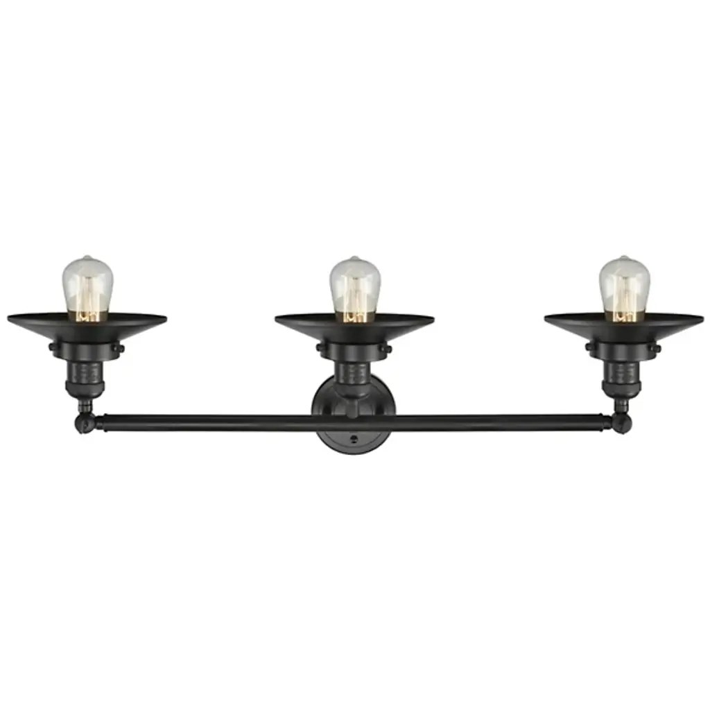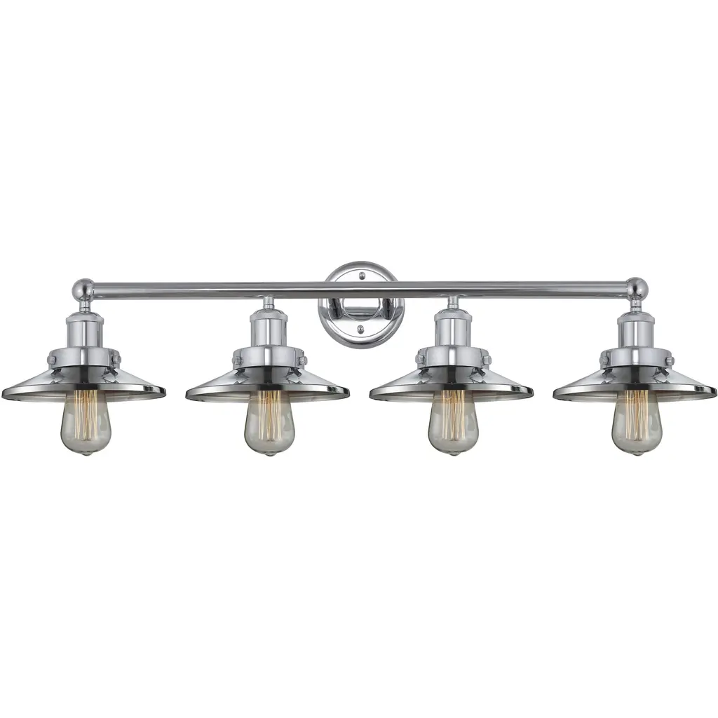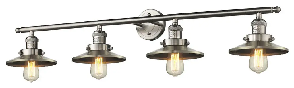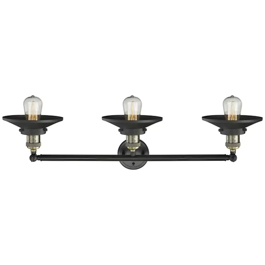 Bring light to your bathroom and beyond with the stylish lines of the Roman Vanity Light by Alder & Ore. A clean contemporary creation from the mind of Bruno Marashlian, it uses a single disc-shaped wall mount and two short stems to support a horizontal rod with a finial at each end that extends four evenly-spaced sockets. Each socket is damp-listed with a metal housing that matches its support structure and is ringed by a shallow dish shade that amplifies any brightness from above, rather than gentling it – perfect for mounting above a mirror to create an environment where you won’t miss a single detail.
