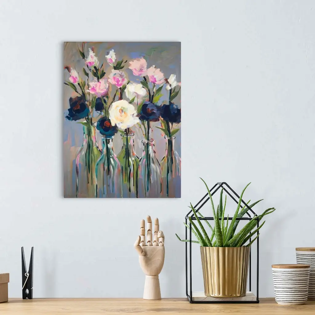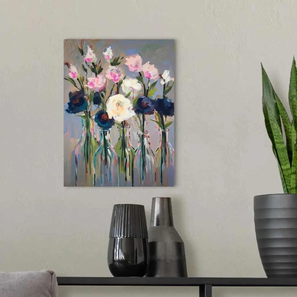 Contemporary artwork of several flowers in a row of tall glass bottles.