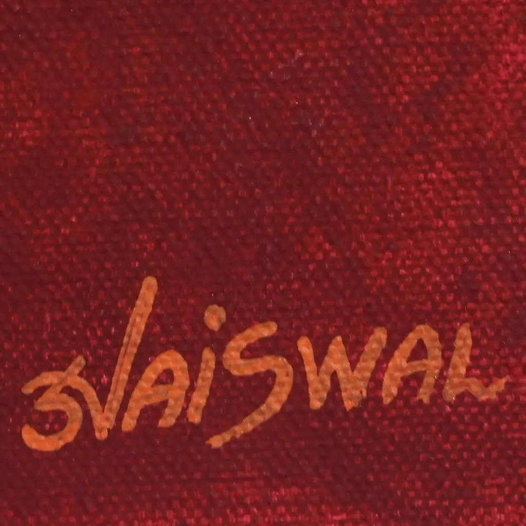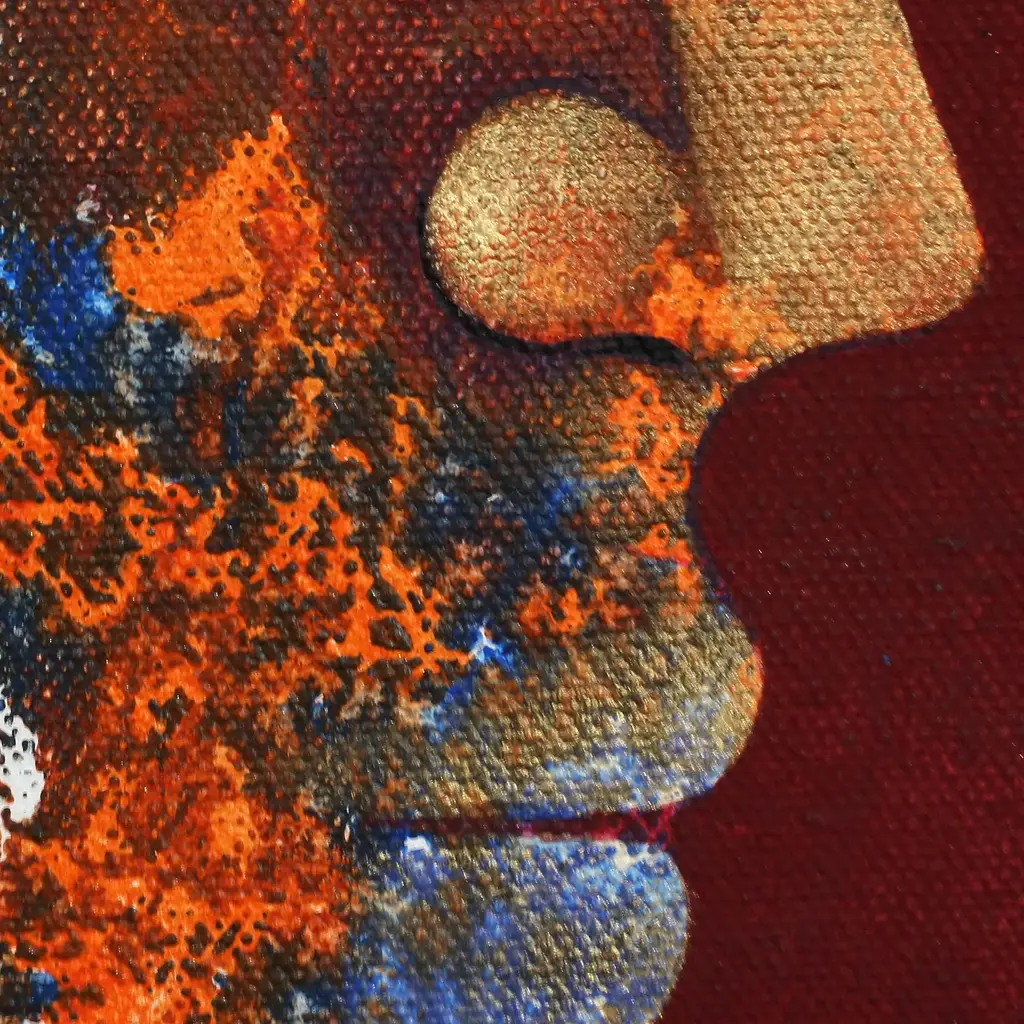 "The love shared between a husband and wife is pure and they will always stay committed to each other," says artist Sunil Jaiswal. "In this painting, the couple appears as one showing the togetherness they share in love and harmony." The expressionist work uses a combination of orange, red, and blue to depict the noble faces.