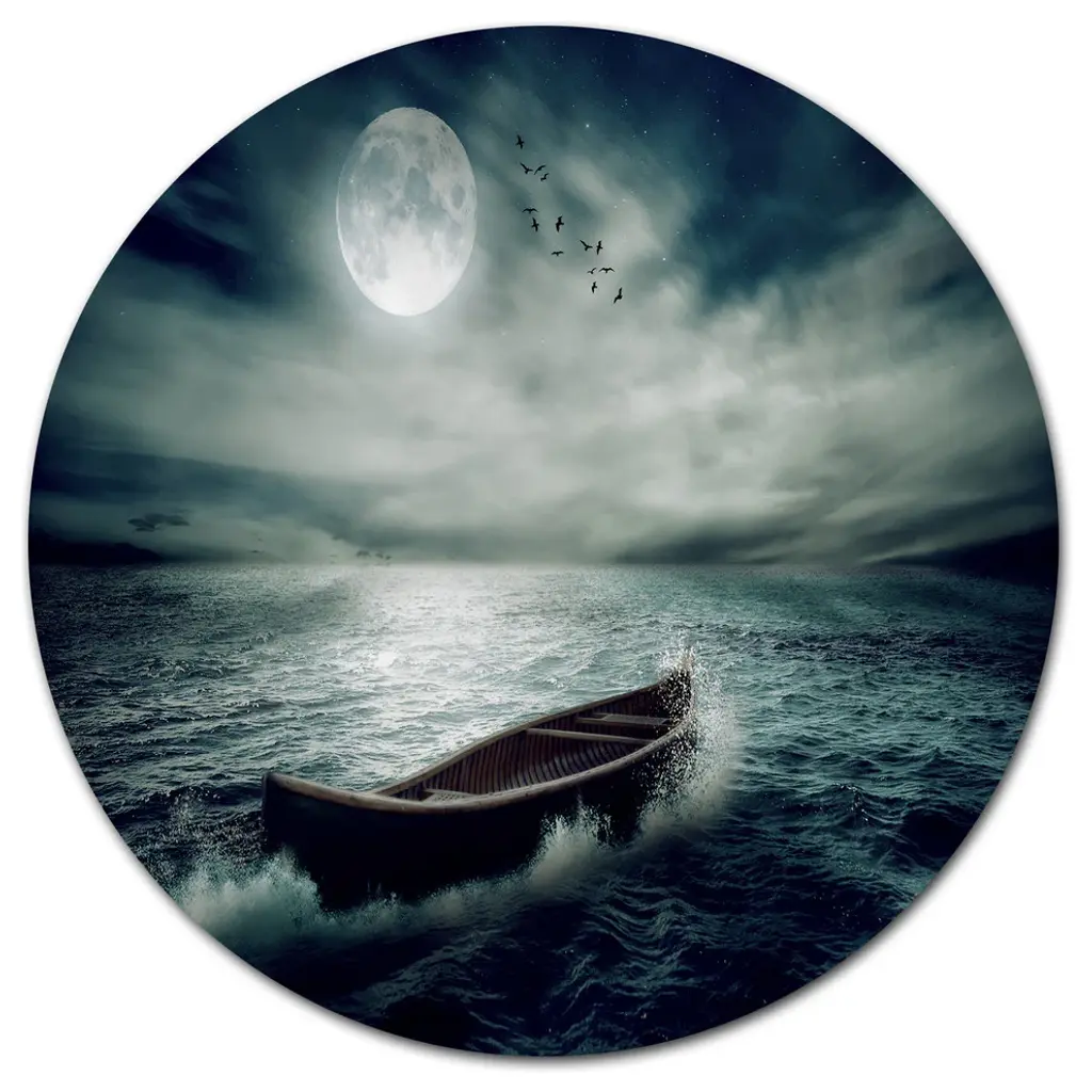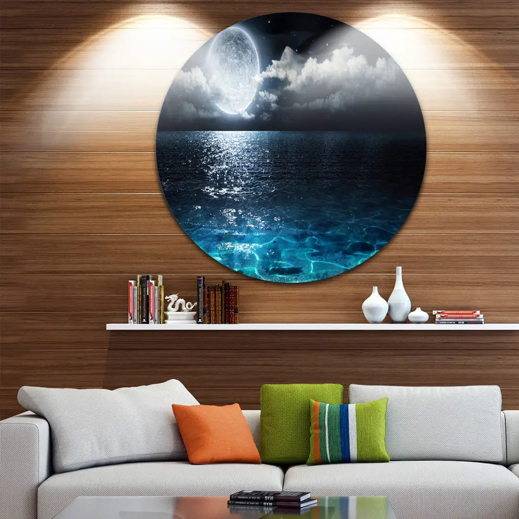 Bring Contemporary Abstraction to your home with this large Circle Metal wall art. This Romantic Full Moon Over Sea Metal Artwork makes it the focal point of any room or office. - White Gloss Coating ensures colors are extra vibrant with light reflection.- Aluminum grade Sheet Metal with 1 inch mounting frame on the back giving the illusion that the artwork is floating on the wall..- Mounting Brackets are included along with instructions.- High Quality Digital images are created directly into a glossy aluminum panel producing a stunning and captivating print into the glossy finish of the metal.- Water, Fire and Scratch resistant HD Aluminum panels.- Looks better than any photo paper and guaranteed to last at least 20 years- Easy to clean with a microfiber cloth. Colors are far superior to regular Canvas Art. - Easy to Hang