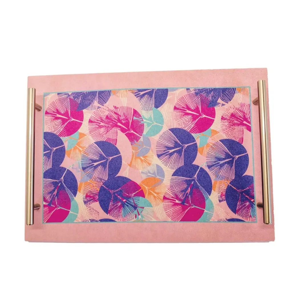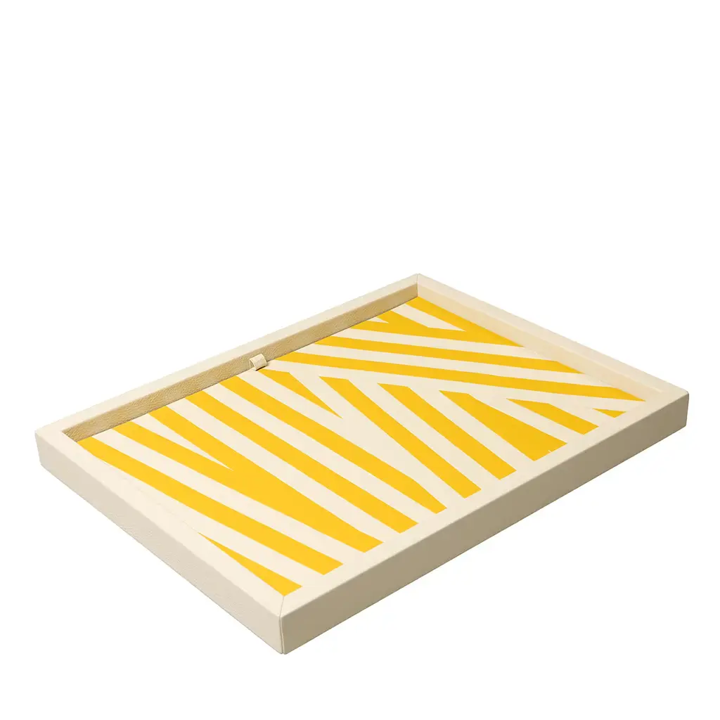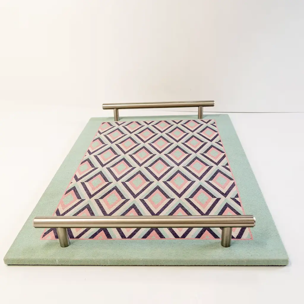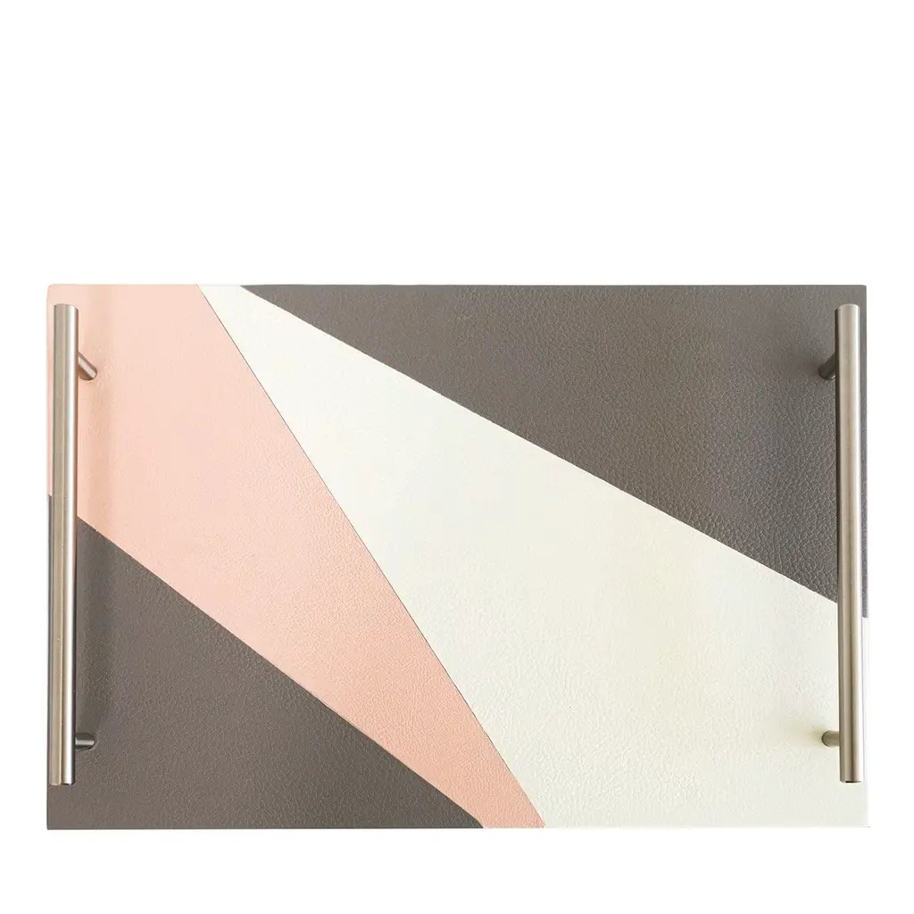 A striking geometrical pattern is what catches the eye when looking at this beautiful rectangular tray, entirely handmade and covered in fine printed leather. Complete with two metal handles on the sides, the tray is a perfect blend of elegance and practicality and comes in a number of different colour options.