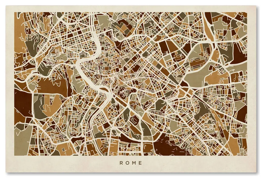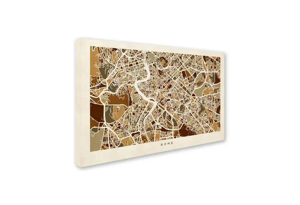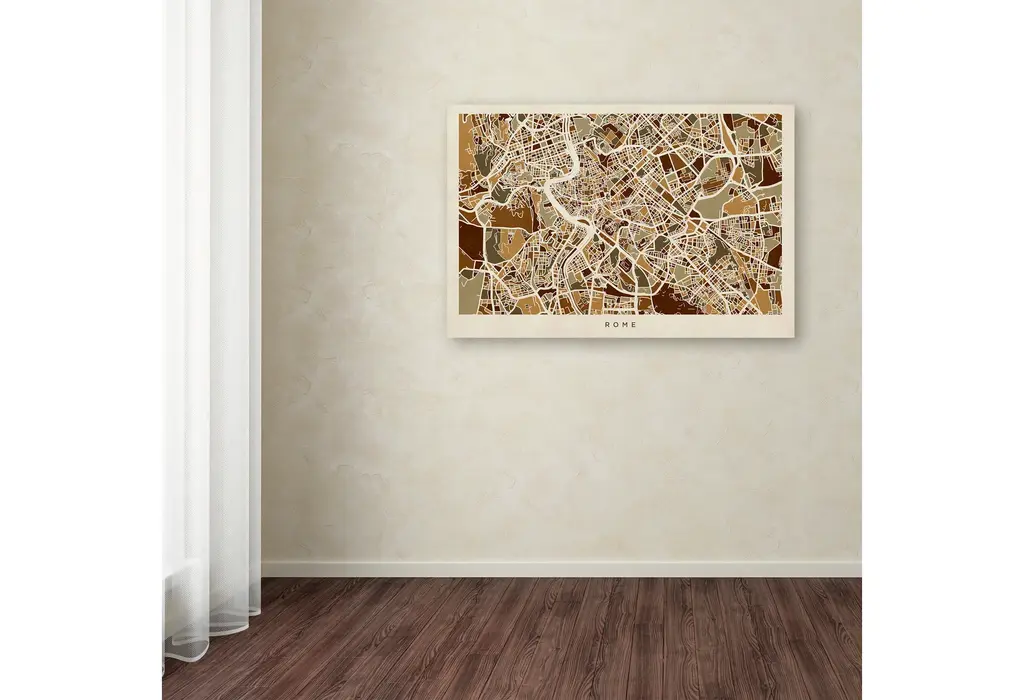 Title: Rome, Italy Street MapArtist: Michael TompsettProduct Type: Canvas ArtSize: 30" x 47"Made in the USA.Art and design were always Michael's favorite subjects at school. He was fortunate to land a job as a graphic designer at one of London's most prestigious publishing companies after leaving University. After 12 highly enjoyable years Michael Tompsett made the decision to pursue a full-time career creating his own work. The freedom and time to be able to focus solely on his own projects has been a wonderful experience. Although Michael likes to experiment with different styles and subjects, his main focus is on map art. He enjoys looking for unique and interesting ways to depict something which is very familiar. Maps are visual representations of the world we live in, a world which is incredibly diverse. Apart from maps, Michael Tompsett creates urban landmark and cityscape designs.This 30" x 47" canvas art is ready to hang. Giclee (jee-clay) is an advanced printmaking process for creating high quality fine art reproductions. The attainable excellence that Giclee printmaking affords makes the reproduction virtually indistinguishable from the original piece. The result is wide acceptance of Giclee by galleries