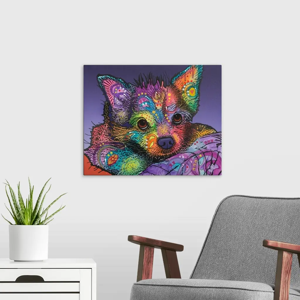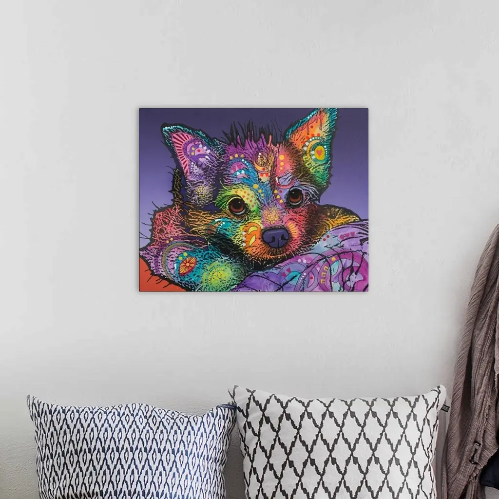 Colorful painting of a puppy with graffiti-like designs laying down with a purple background.