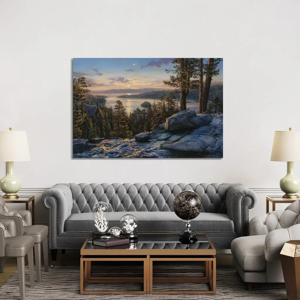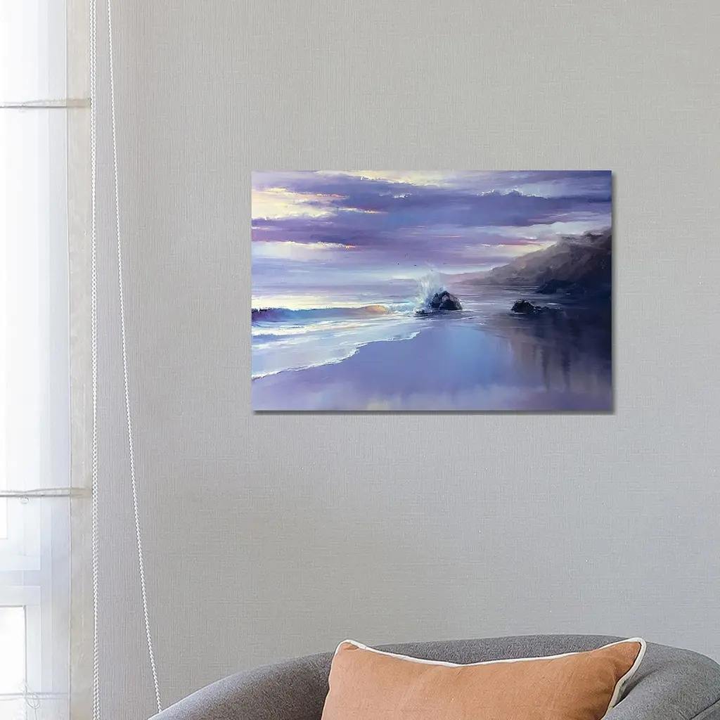 Artist: Ron ParkerSubject: LandscapeStyle: CoastalProduct Type: Gallery-Wrapped Canvas ArtMade in USAThis ready to hang, gallery-wrapped art piece features a stream running on towards the ocean.Ron Parker began painting as a career a little late in life. At the age of 35, he was inspired, after seeing an exhibition of original paintings by Fenwick Lansdowne, to try painting wildlife himself. His first effort, in 1977, was successful and he quit work and began painting full time. Using watercolors, a medium with which he was familiar, he began doing vignette paintings of birds and mammals, Within four months he was selling originals through the Harrison Gallery in Vancouver.Giclee (jee-clay) is an advanced printmaking process for creating high quality fine art reproductions. The attainable excellence that Giclee printmaking affords makes the reproduction virtually indistinguishable from the original piece. The result is wide acceptance of Giclee by galleries, museums, and private collectors. Gallery wrap is a method of stretching an artist's canvas so that the canvas wraps around the sides and is secured a hidden, wooden frame. This method of stretching and preparing a canvas allows for a frameless presentation of the finished painting.