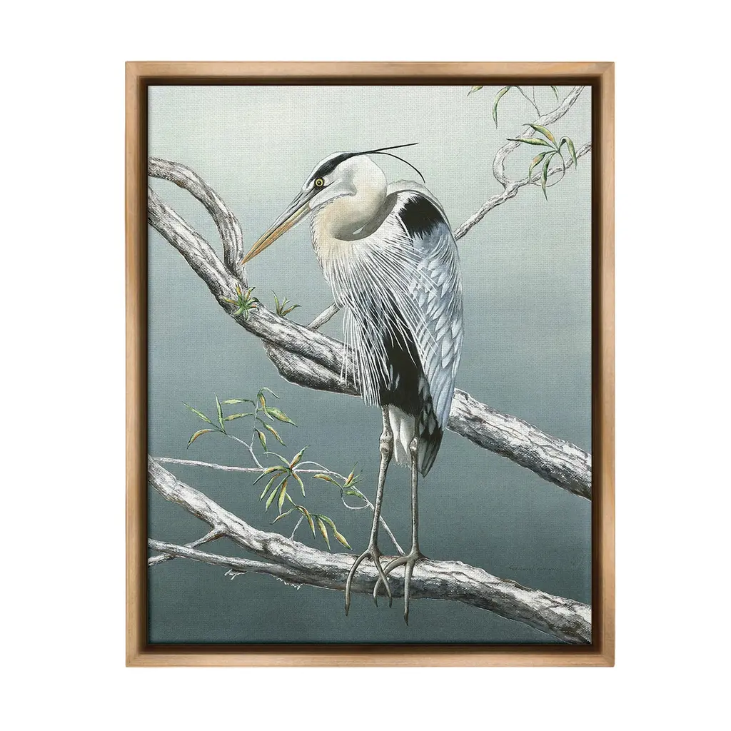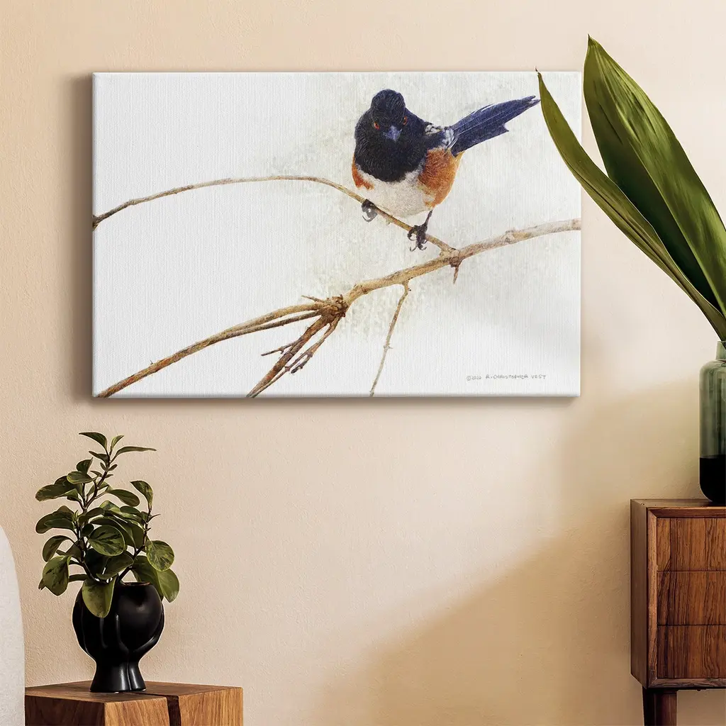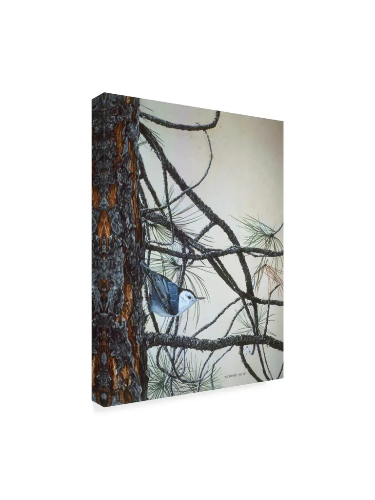 Artist: Ron ParkerSubject: AnimalsStyle: Natural ModernProduct Type: Gallery-Wrapped Canvas ArtMade in USAThis ready to hang, gallery-wrapped art piece features a white breasted nuthatch resting on a pine tree.Ron Parker began painting as a career a little late in life. At the age of 35, he was inspired, after seeing an exhibition of original paintings by Fenwick Lansdowne, to try painting wildlife himself. His first effort, in 1977, was successful and he quit work and began painting full time. Using watercolors, a medium with which he was familiar, he began doing vignette paintings of birds and mammals, Within four months he was selling originals through the Harrison Gallery in Vancouver.Giclee (jee-clay) is an advanced printmaking process for creating high quality fine art reproductions. The attainable excellence that Giclee printmaking affords makes the reproduction virtually indistinguishable from the original piece. The result is wide acceptance of Giclee by galleries, museums, and private collectors. Gallery wrap is a method of stretching an artist's canvas so that the canvas wraps around the sides and is secured a hidden, wooden frame. This method of stretching and preparing a canvas allows for a frameless presentation of the finished painting.