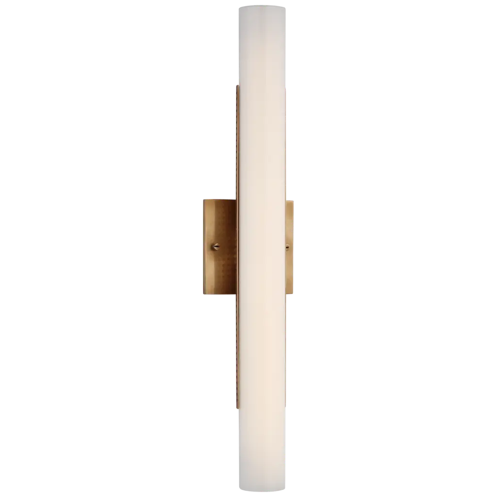 Sleek, sophisticated and modern. The Rona LED Vanity Light by Kuzco Lighting is minimalistic and refined. A cylindrical White Opal Glass rod establishes a linear form while providing a warm illumination along its length. Architecturally inspired trim detailing elevates the metallic elements of this fixture, encircling the glass rod and anchoring everything to the wall with a square backplate. Able to be installed vertically or horizontally, form meets function and compliments bathroom spaces both big and small.
