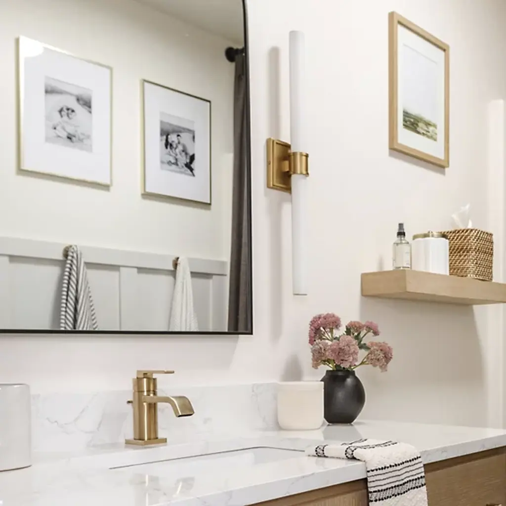Sleek, sophisticated and modern. The Rona LED Vanity Light by Kuzco Lighting is minimalistic and refined. A cylindrical White Opal Glass rod establishes a linear form while providing a warm illumination along its length. Architecturally inspired trim detailing elevates the metallic elements of this fixture, encircling the glass rod and anchoring everything to the wall with a square backplate. Able to be installed vertically or horizontally, form meets function and compliments bathroom spaces both big and small.
