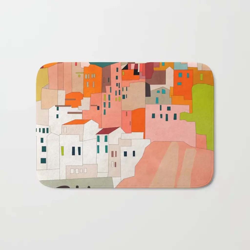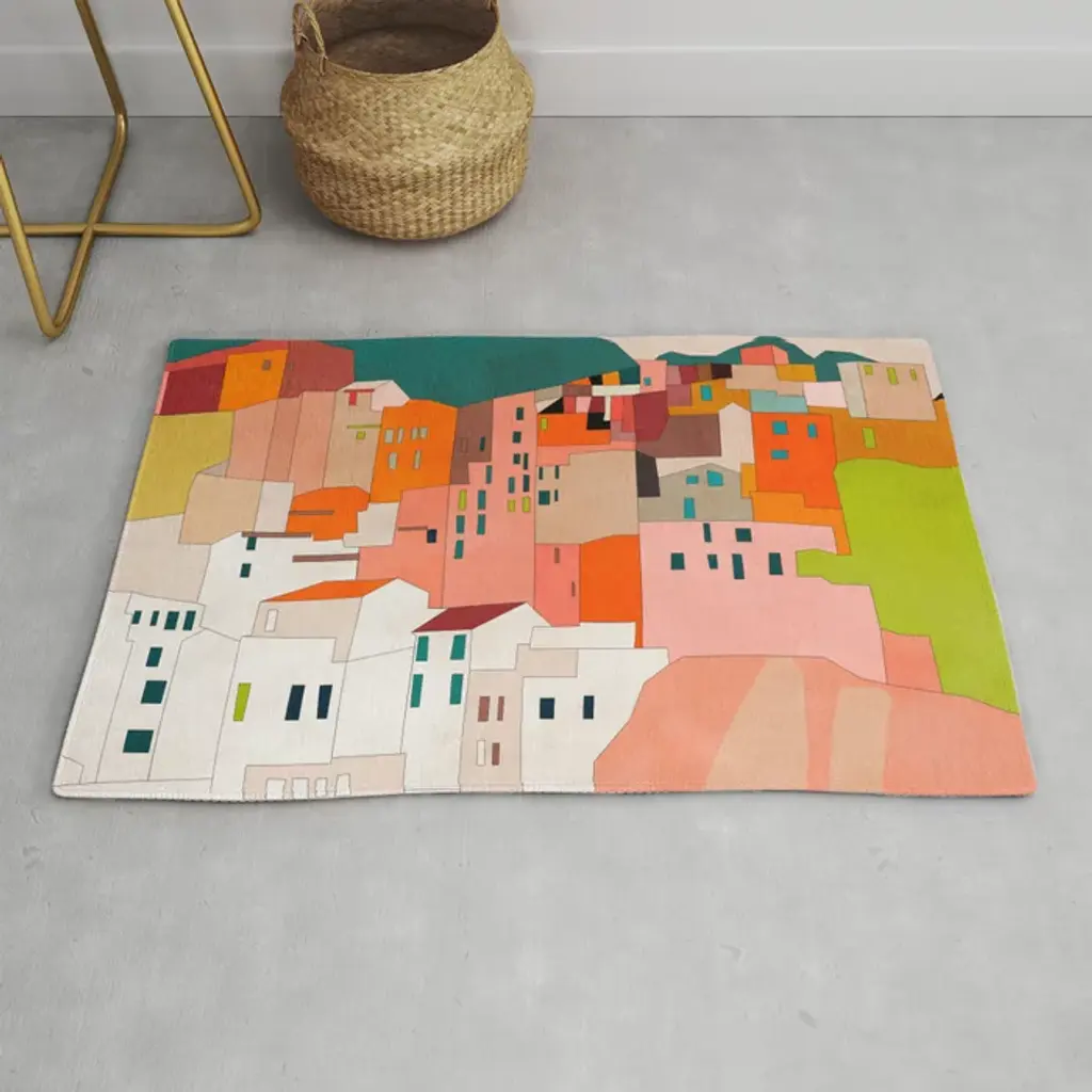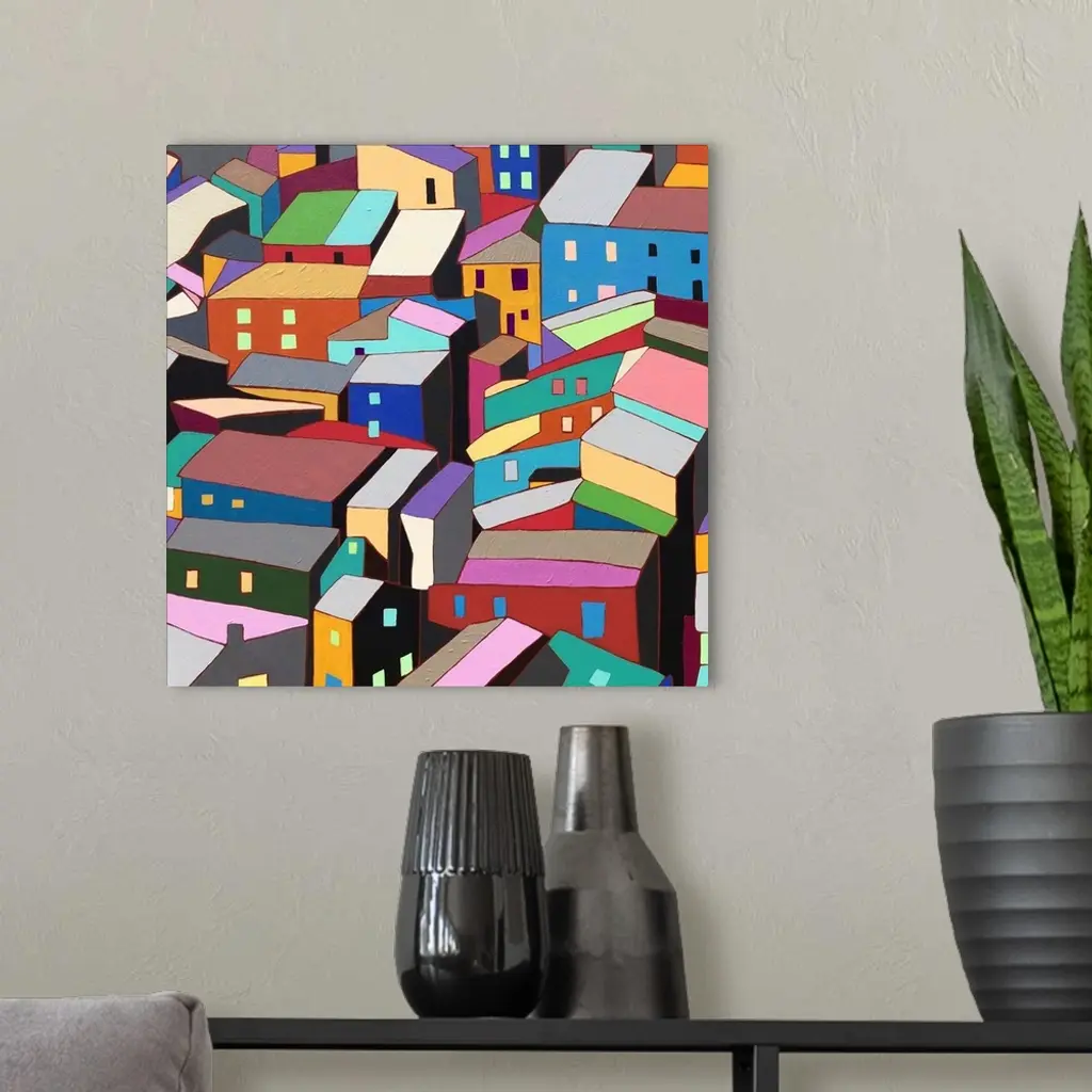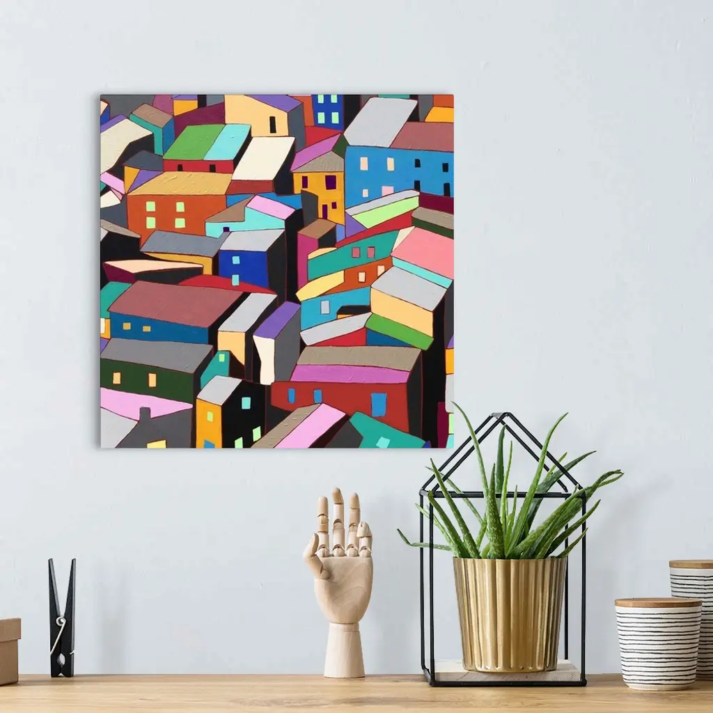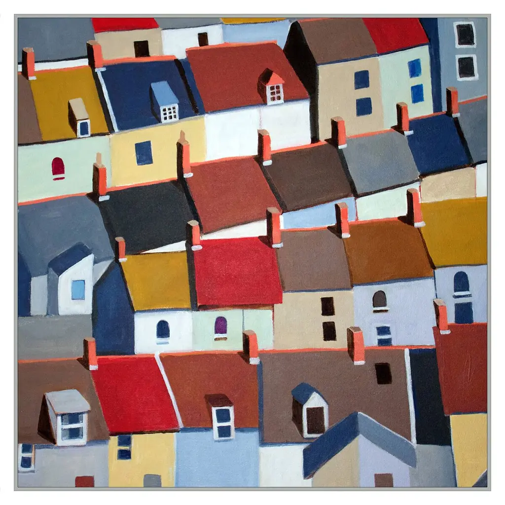 Contemporary painting of colorful houses seen from above.