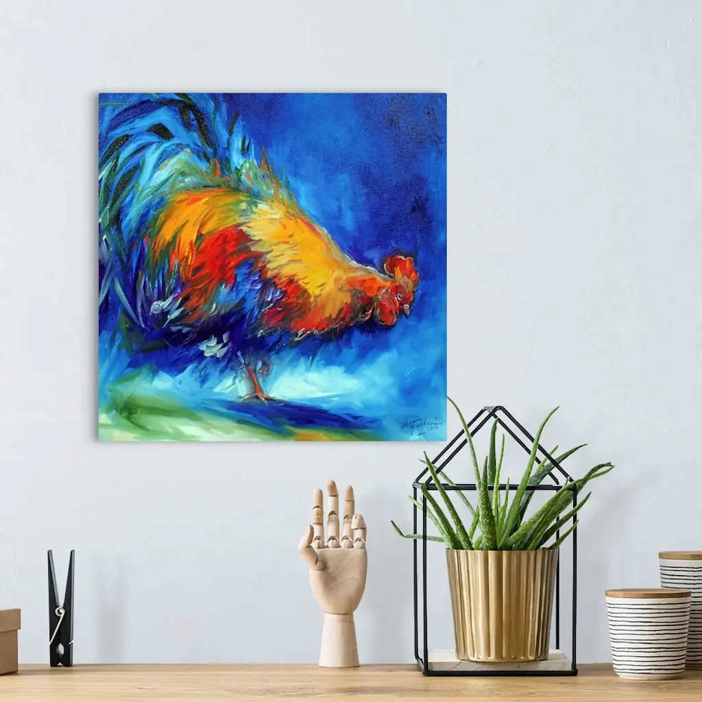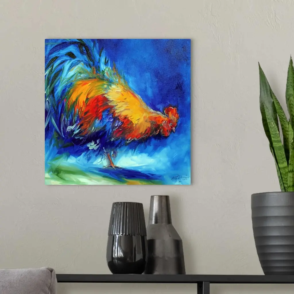 Square painting of a colorful rooster created with vibrant blue, red, and gold hues.