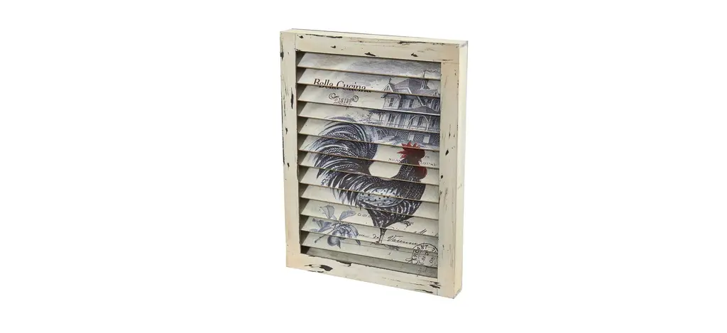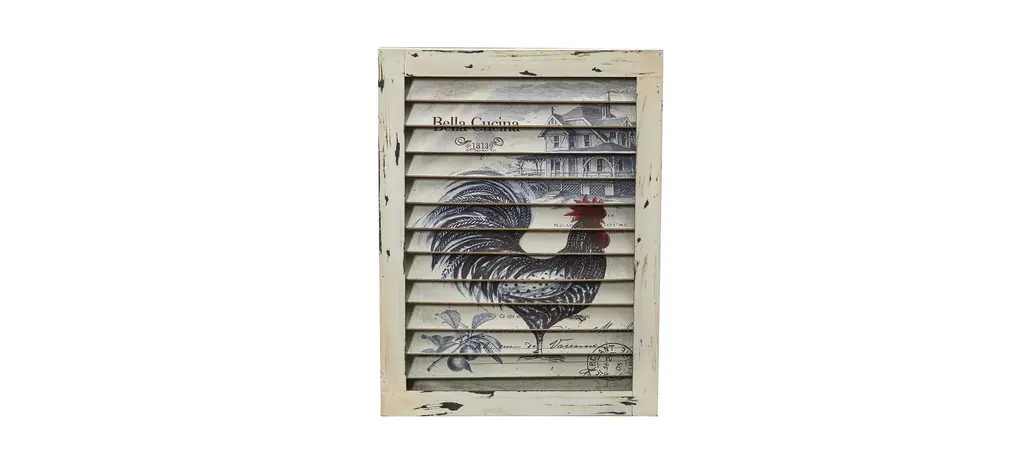 This Rooster Window Shutter Wall Decor can be an interesting addition to your kitchen, dining room, or anywhere! Set in a single frame, the painted shutters and washed wood create a vintage or rustic feel.