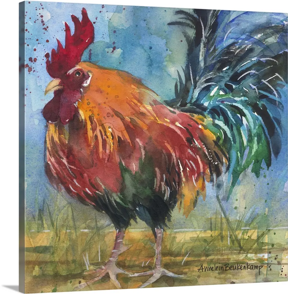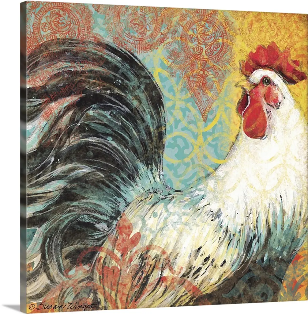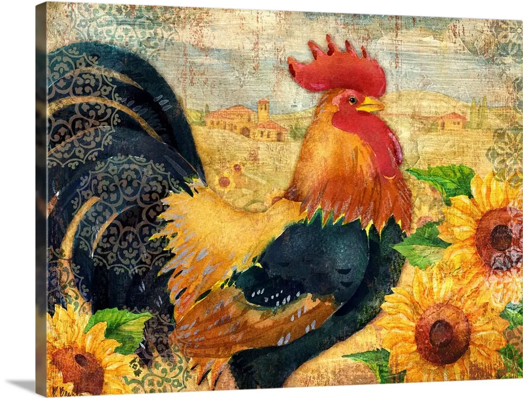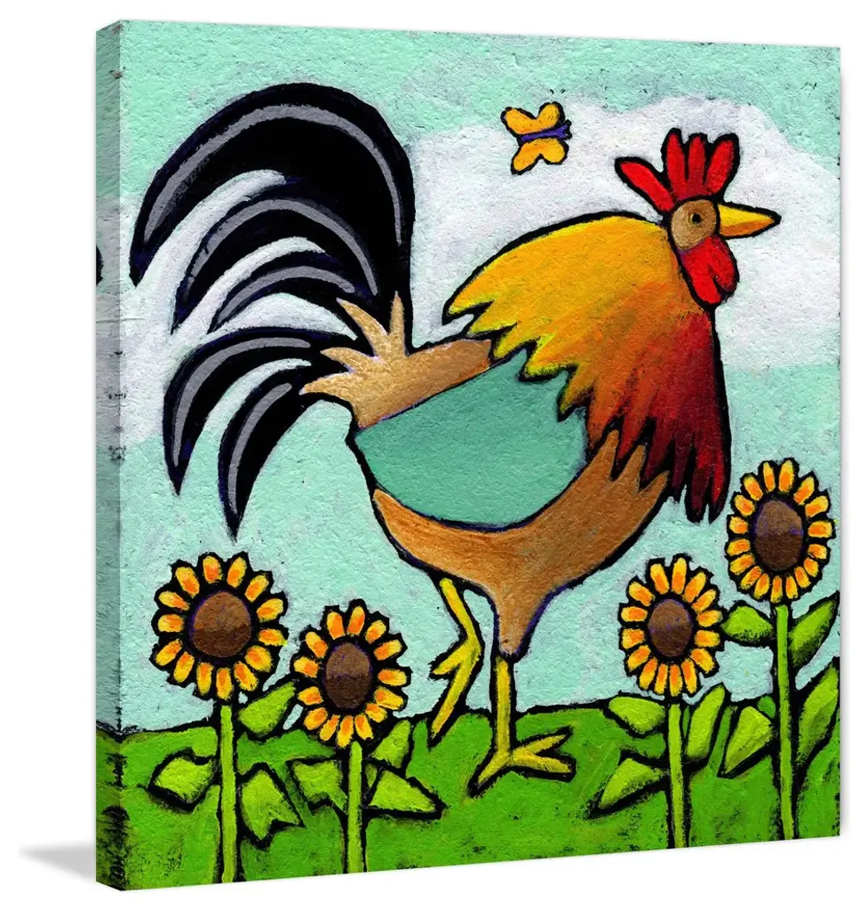 "Rooster With Sunflowers" By Janet Nelson Print Wrapped Canvas, 24x24