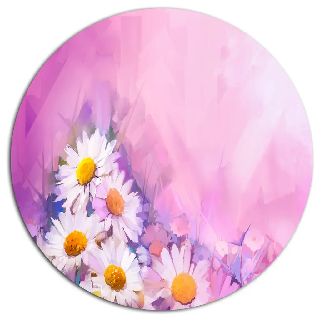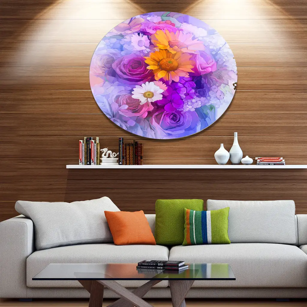 Bring Contemporary Abstraction to your home with this large Circle Metal wall art. This Rose Daisy and Gerbera Flowers Metal Artwork makes it the focal point of any room or office. - White Gloss Coating ensures colors are extra vibrant with light reflection.- Aluminum grade Sheet Metal with 1 inch mounting frame on the back giving the illusion that the artwork is floating on the wall..- Mounting Brackets are included along with instructions.- High Quality Digital images are created directly into a glossy aluminum panel producing a stunning and captivating print into the glossy finish of the metal.- Water, Fire and Scratch resistant HD Aluminum panels.- Looks better than any photo paper and guaranteed to last at least 20 years- Easy to clean with a microfiber cloth. Colors are far superior to regular Canvas Art. - Easy to Hang