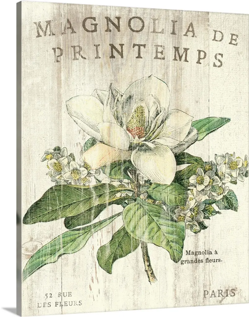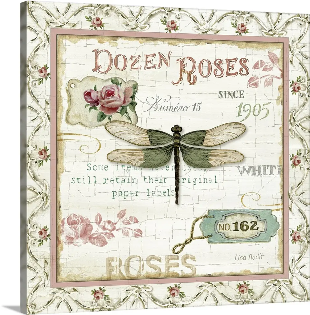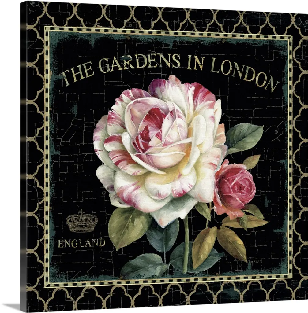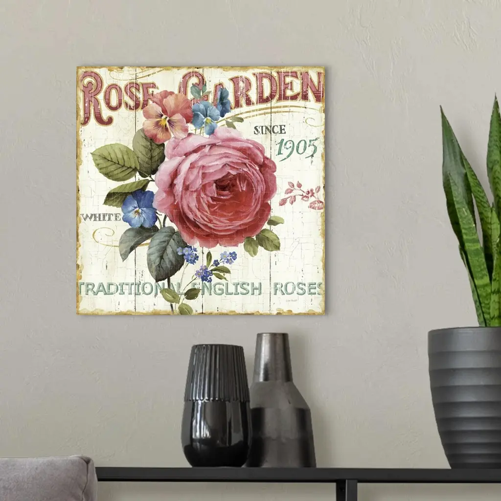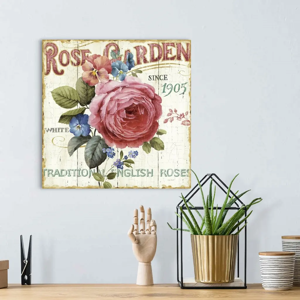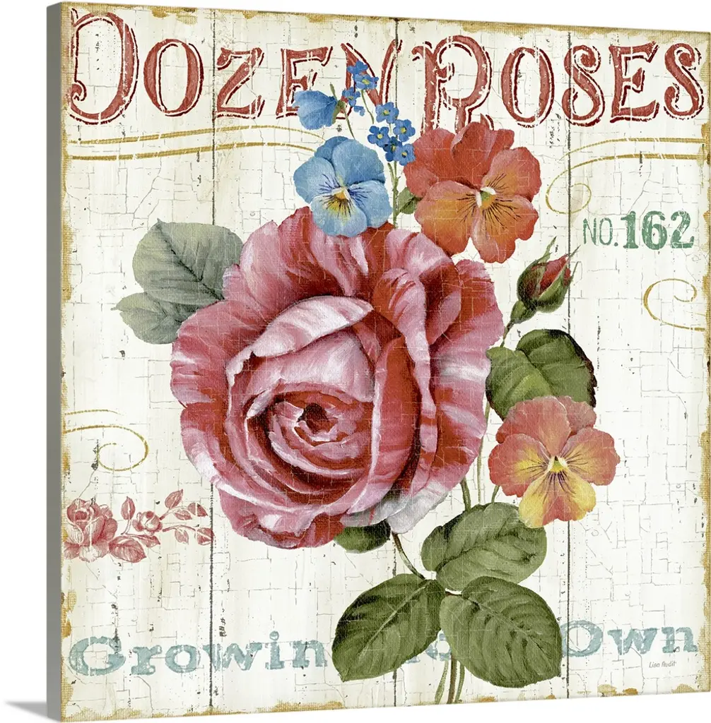 Square painting on canvas of a rose and other flowers in the middle with text around it on a grungy backdrop.
