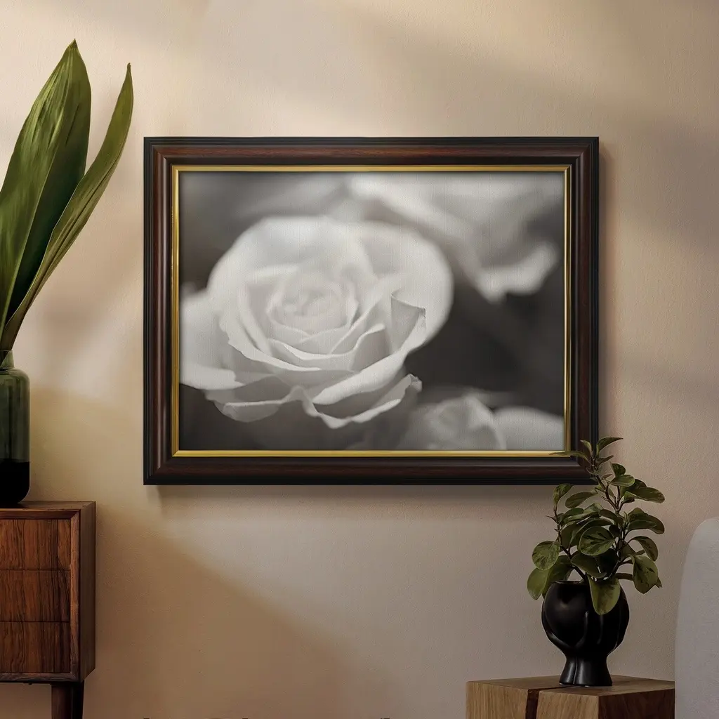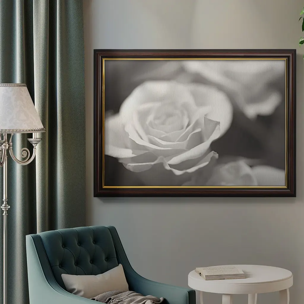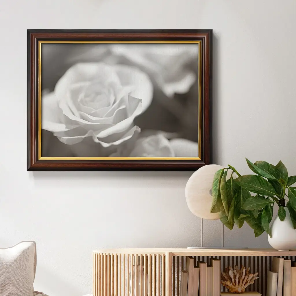 Rose Studies IV Premium Framed Canvas- Ready to Hang A Premium Framed Canvas created to last. Framed in distressed wood and available in an array of sizes and colors Featuring a beveled a solid wood stretcher bar, each piece comes ready to hand 3 SIZES AVAILABLE 16''X20'' - Overall Size 18'X27'' - Overall Size 24''x36'' - Overall Size Each piece is made to order. Each piece comes with hanging hardware. Made in the USA Ready to Hang Giclee Paper Print Acrylic Glass Beveled Matt Board