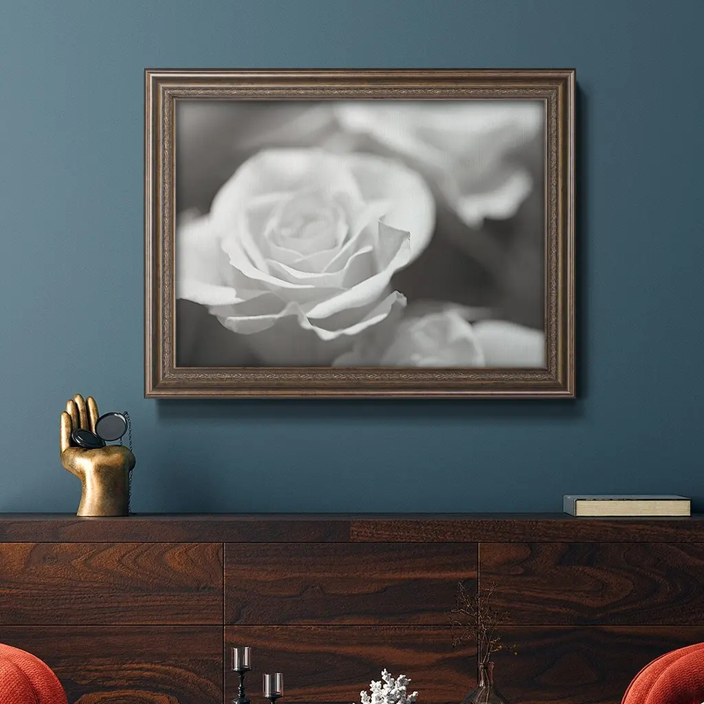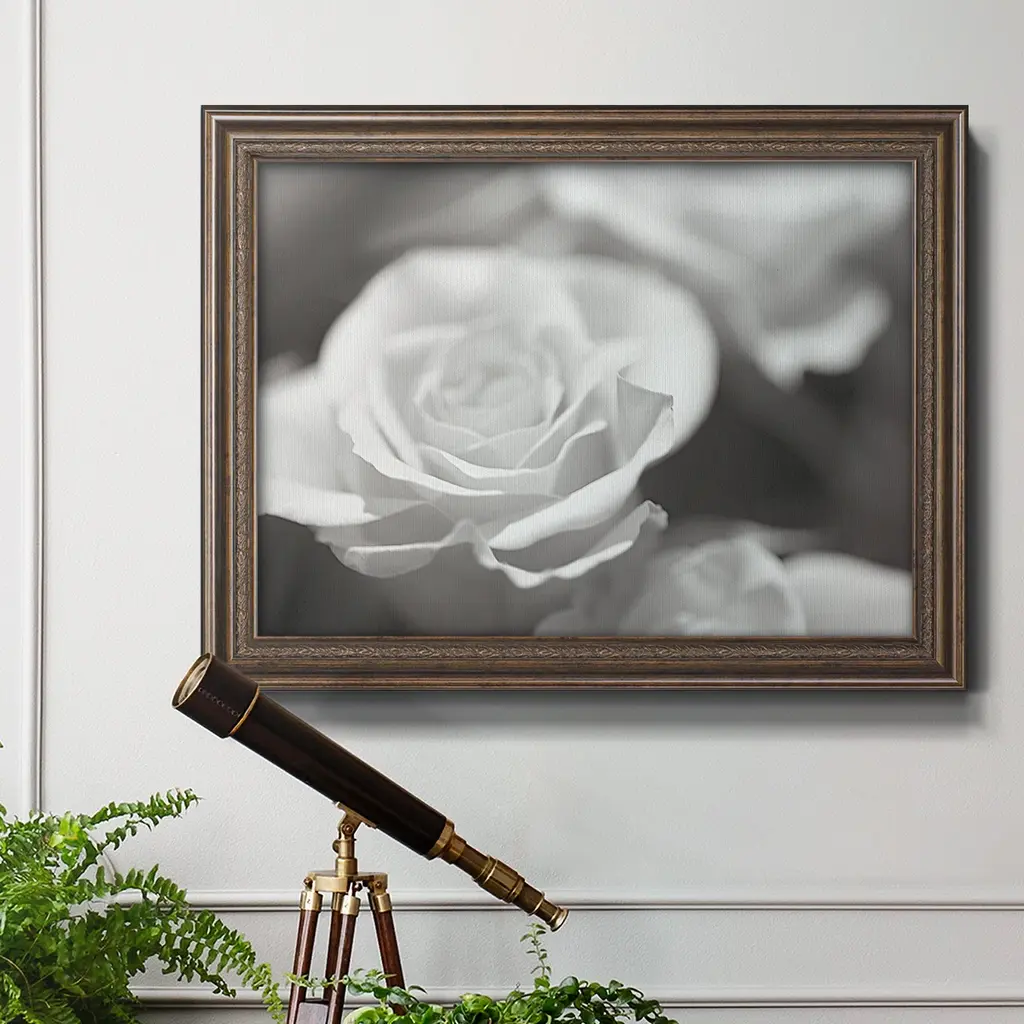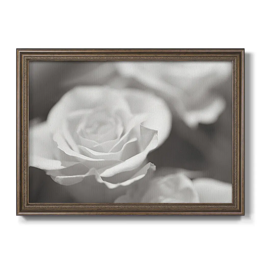 Rose Studies IV Premium Framed Canvas- Ready to Hang A Premium Framed Canvas created to last. Framed in distressed wood and available in an array of sizes and colors Featuring a beveled a solid wood stretcher bar, each piece comes ready to hand 3 SIZES AVAILABLE 16''X20'' - Overall Size 18'X27'' - Overall Size 24''x36'' - Overall Size Each piece is made to order. Each piece comes with hanging hardware. Made in the USA Ready to Hang Giclee Paper Print Acrylic Glass Beveled Matt Board