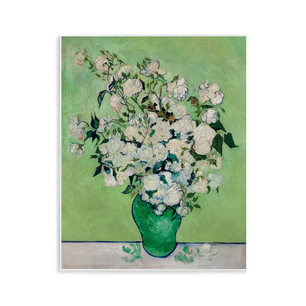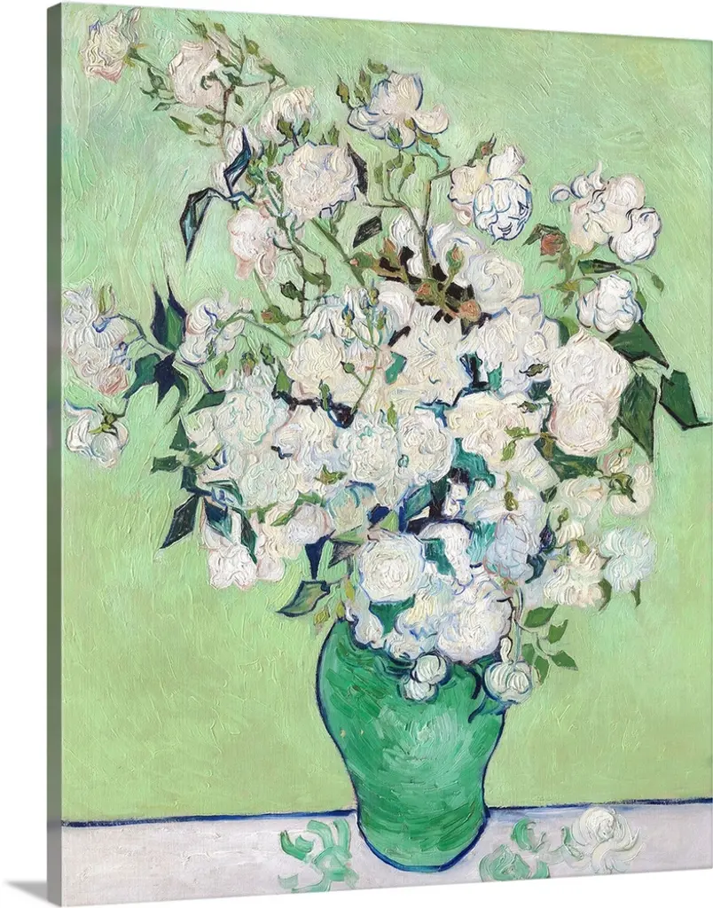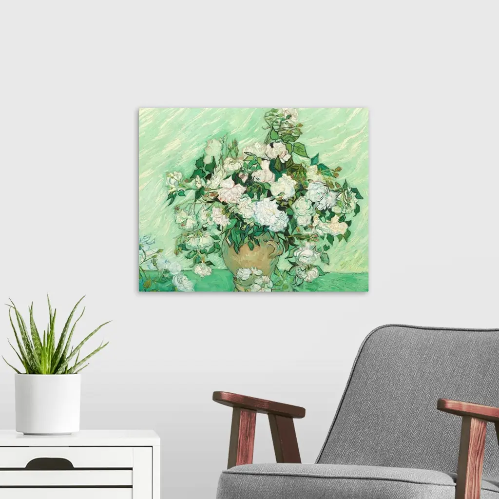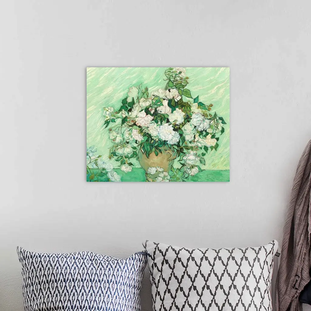Roses, by Vincent van Gogh, 1890, Dutch Post-Impressionist painting, oil on canvas. It is among his largest and most beautiful still lifes, with an exuberant bouquet. It has a fresh spring green background with undulating ribbons of paint. Originally, the