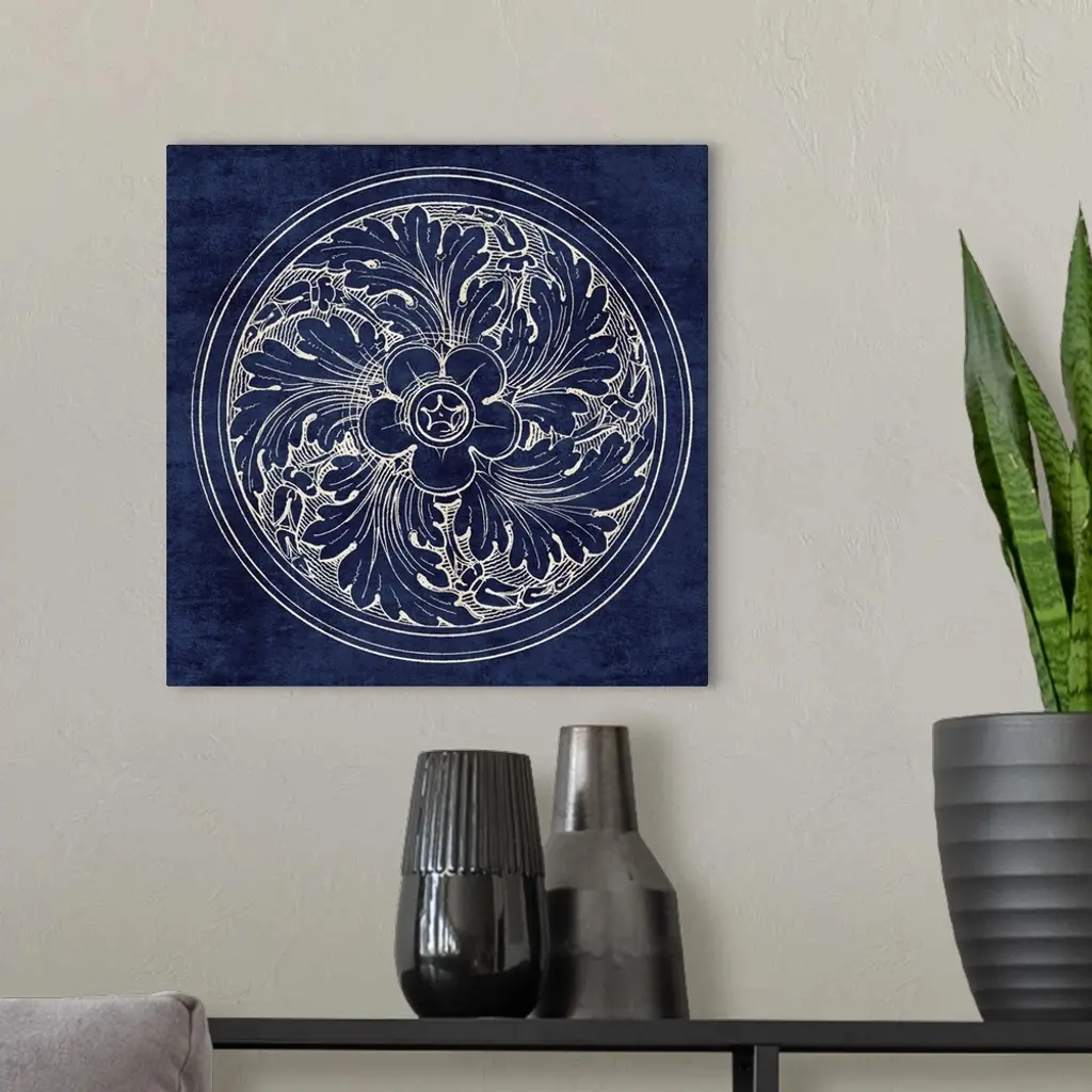 Contemporary artwork of a vintage stylized rosette in dark blue.