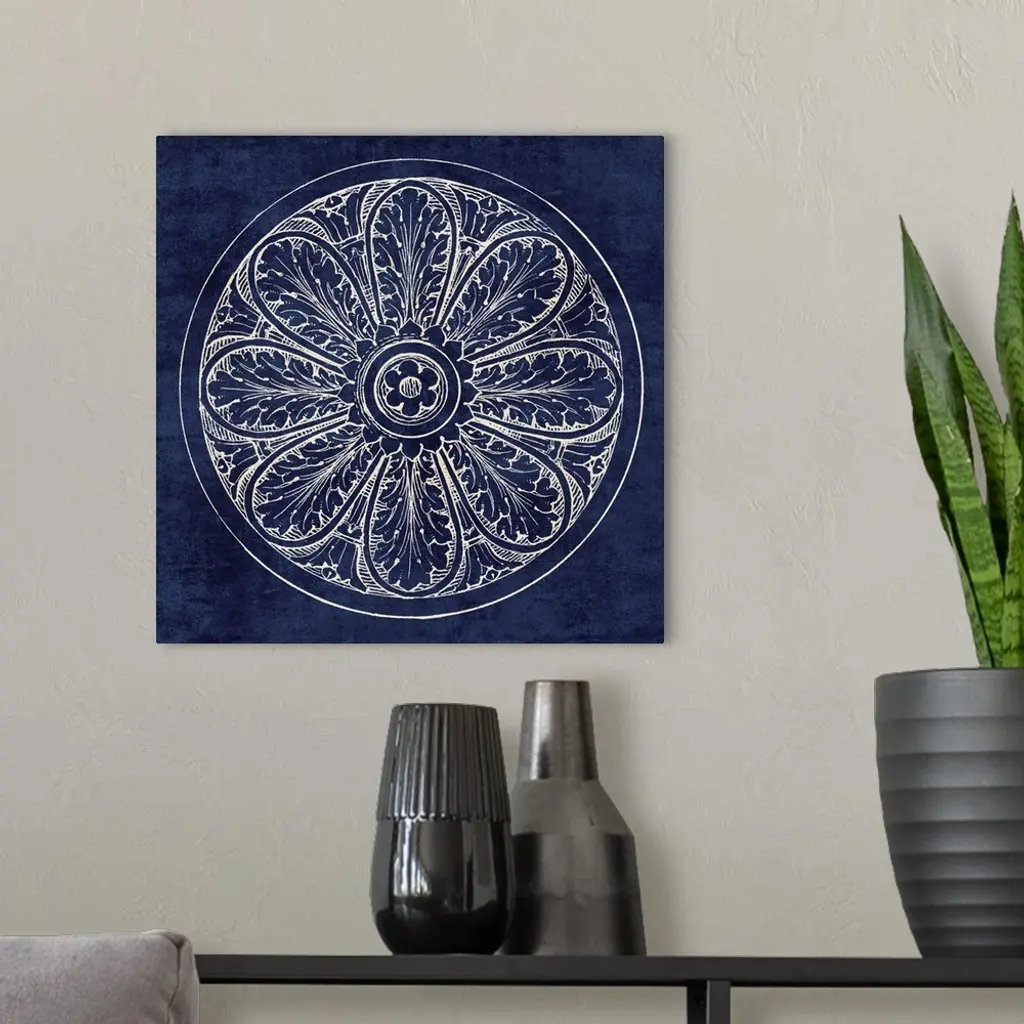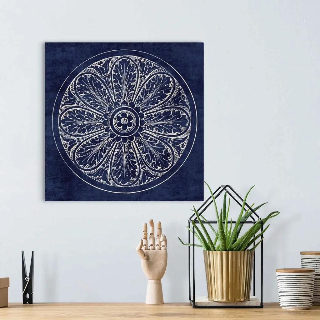 Contemporary artwork of a vintage stylized rosette in dark blue.