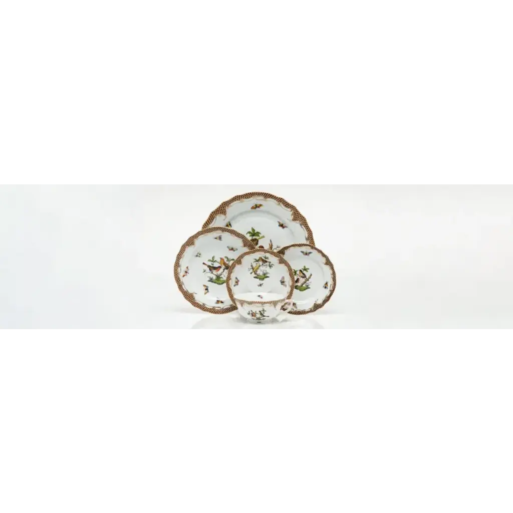 Many connoisseurs consider this pattern, first created in 1860 for the Rothschild family of Europe, to be the epitome of hand painting on porcelain. Twelve different motifs portray a 19th century tale about Baroness Rothschild, who lost her pearl necklace in the garden of her Vienna residence. Several days later it was found by her gardener, who saw birds playing with it in a tree. The Rothschild Bird Border variations feature handsomely painted borders. Hand painted in Hungary. Now the biggest porcelain manufactory in Europe, Herend was founded in 1826 to produce earthenware in the small Hungarian village for which it was named. At the time, Hungary was flooded with low-cost pottery, but in 1839, Mor Fischer became the Manufactory’s new owner and he decided to focus on producing dinnerware replacement pieces for Europe’s royal families to complement their valuable porcelain patterns from Germany and the Far East. As his client base grew, Fischer commissioned his artists to begin designing dinnerware patterns of their own. Queen Victoria’s 1851 purchase of a large set for Windsor Castle was a milestone, setting the stage for aristocrats throughout Europe to clamor for Herend in their estates. In the 1850s, Herend added meticulously-crafted figurines to its creations. Herend’s trademark fishnet pattern, which is widely recognized and prized as Herend’s signature design, started in 1858 when an artist who was intrigued with a Chinese plate’s fish scale design painted it onto a rooster figurine to imitate feathers.