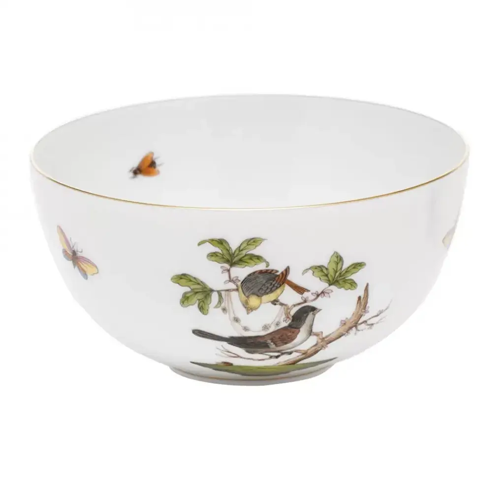 Many connoisseurs consider this pattern, first created in 1860 for the Rothschild family of Europe, to be the epitome of hand painting on porcelain. Twelve different motifs portray a 19th century tale about Baroness Rothschild, who lost her pearl necklace in the garden of her Vienna residence. Several days later it was found by her gardener, who saw birds playing with it in a tree. Hand painted in Hungary. Now the biggest porcelain manufactory in Europe, Herend was founded in 1826 to produce earthenware in the small Hungarian village for which it was named. At the time, Hungary was flooded with low-cost pottery, but in 1839, Mor Fischer became the Manufactory’s new owner and he decided to focus on producing dinnerware replacement pieces for Europe’s royal families to complement their valuable porcelain patterns from Germany and the Far East. As his client base grew, Fischer commissioned his artists to begin designing dinnerware patterns of their own. Queen Victoria’s 1851 purchase of a large set for Windsor Castle was a milestone, setting the stage for aristocrats throughout Europe to clamor for Herend in their estates. In the 1850s, Herend added meticulously-crafted figurines to its creations. Herend’s trademark fishnet pattern, which is widely recognized and prized as Herend’s signature design, started in 1858 when an artist who was intrigued with a Chinese plate’s fish scale design painted it onto a rooster figurine to imitate feathers.