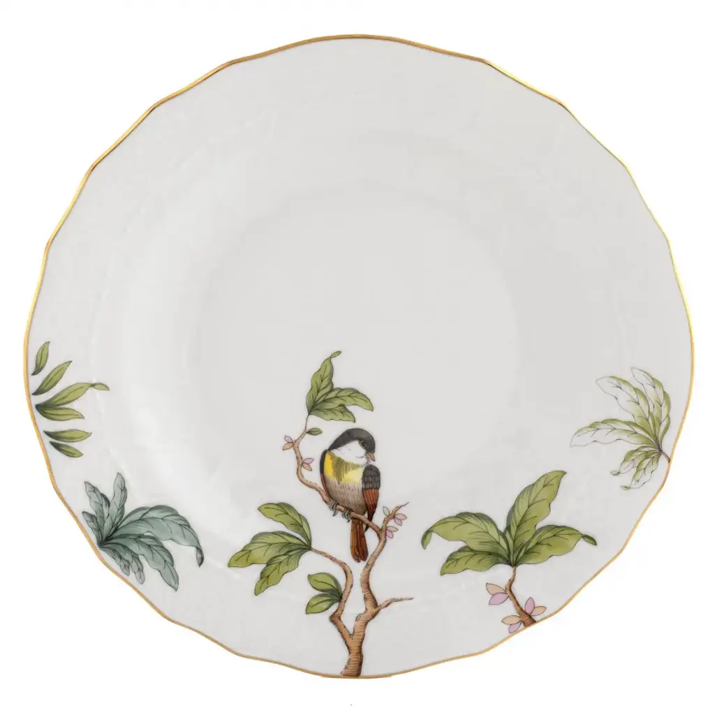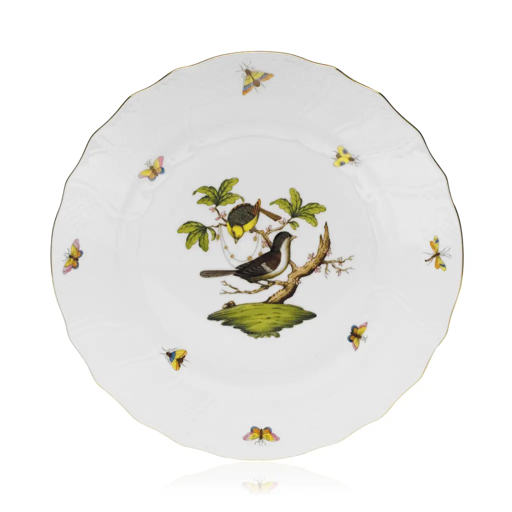Many connoisseurs consider this pattern, first created in 1860 for the Rothschild family of Europe, to be the epitome of hand painting on porcelain. Twelve different motifs portray a 19th century tale about Baroness Rothschild, who lost her pearl necklace in the garden of her Vienna residence. Several days later it was found by her gardener, who saw birds playing with it in a tree. The Rothschild Bird Border variations feature handsomely painted borders. Hand painted in Hungary. Now the biggest porcelain manufactory in Europe, Herend was founded in 1826 to produce earthenware in the small Hungarian village for which it was named. At the time, Hungary was flooded with low-cost pottery, but in 1839, Mor Fischer became the Manufactory’s new owner and he decided to focus on producing dinnerware replacement pieces for Europe’s royal families to complement their valuable porcelain patterns from Germany and the Far East. As his client base grew, Fischer commissioned his artists to begin designing dinnerware patterns of their own. Queen Victoria’s 1851 purchase of a large set for Windsor Castle was a milestone, setting the stage for aristocrats throughout Europe to clamor for Herend in their estates. In the 1850s, Herend added meticulously-crafted figurines to its creations. Herend’s trademark fishnet pattern, which is widely recognized and prized as Herend’s signature design, started in 1858 when an artist who was intrigued with a Chinese plate’s fish scale design painted it onto a rooster figurine to imitate feathers.