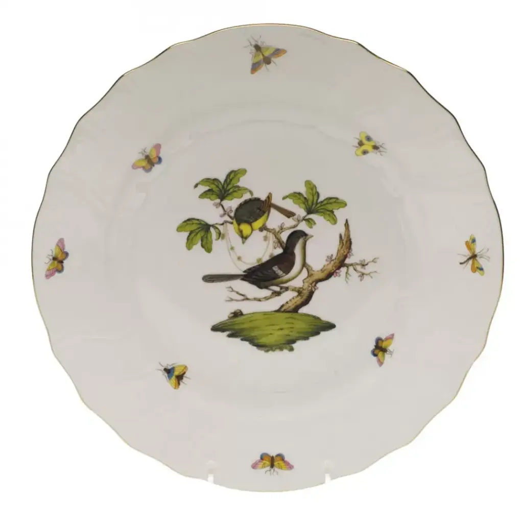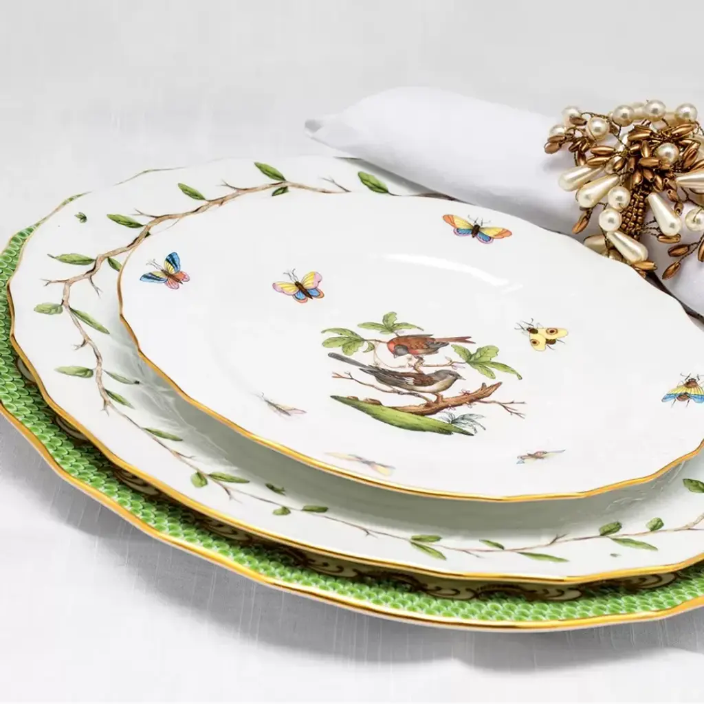 Many connoisseurs consider this pattern, first created in 1860 for the Rothschild family of Europe, to be the epitome of hand painting on porcelain. Twelve different motifs portray a 19th century tale about Baroness Rothschild, who lost her pearl necklace in the garden of her Vienna residence. Several days later it was found by her gardener, who saw birds playing with it in a tree. Hand painted in Hungary. Now the biggest porcelain manufactory in Europe, Herend was founded in 1826 to produce earthenware in the small Hungarian village for which it was named. At the time, Hungary was flooded with low-cost pottery, but in 1839, Mor Fischer became the Manufactory’s new owner and he decided to focus on producing dinnerware replacement pieces for Europe’s royal families to complement their valuable porcelain patterns from Germany and the Far East. As his client base grew, Fischer commissioned his artists to begin designing dinnerware patterns of their own. Queen Victoria’s 1851 purchase of a large set for Windsor Castle was a milestone, setting the stage for aristocrats throughout Europe to clamor for Herend in their estates. In the 1850s, Herend added meticulously-crafted figurines to its creations. Herend’s trademark fishnet pattern, which is widely recognized and prized as Herend’s signature design, started in 1858 when an artist who was intrigued with a Chinese plate’s fish scale design painted it onto a rooster figurine to imitate feathers.