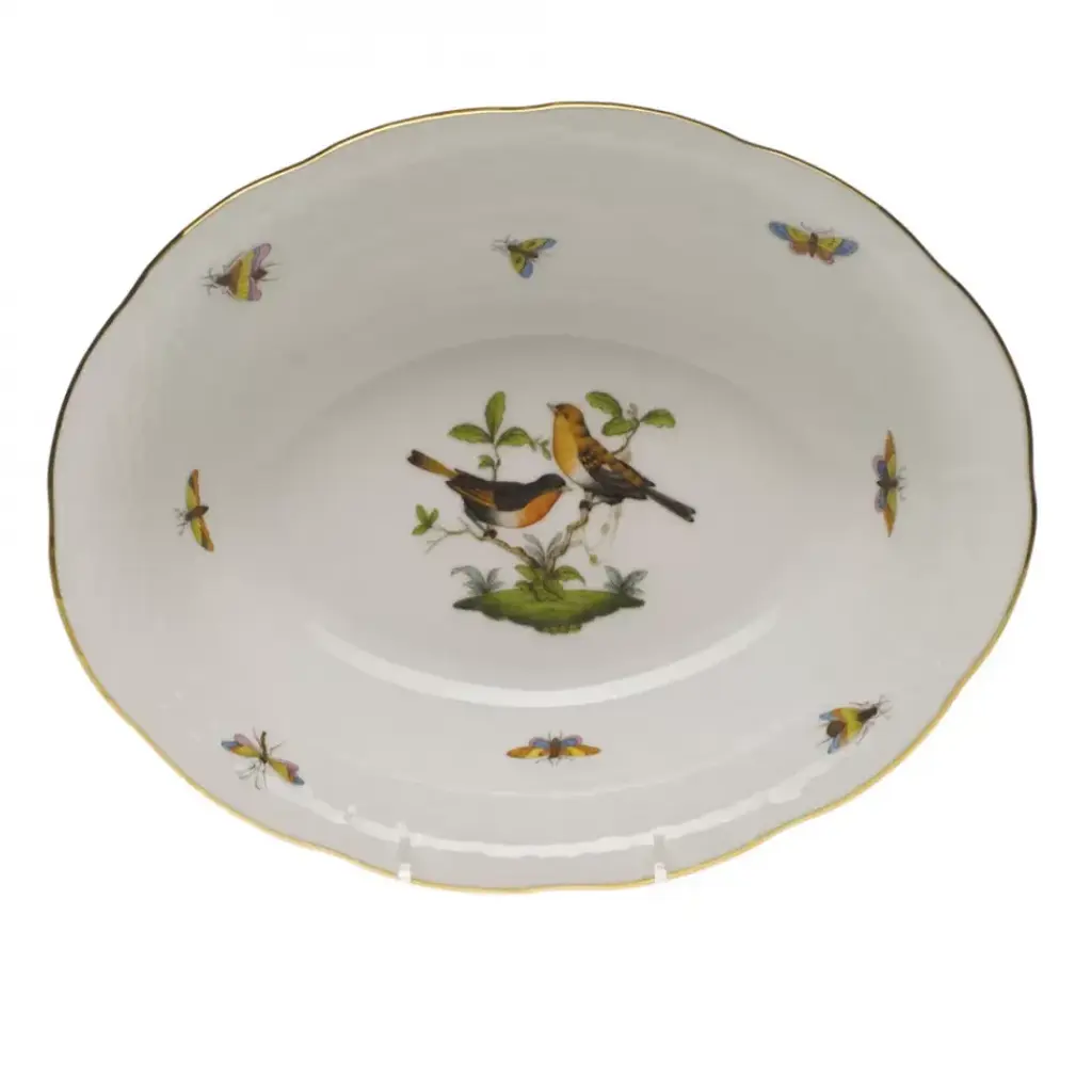 Many connoisseurs consider this pattern, first created in 1860 for the Rothschild family of Europe, to be the epitome of hand painting on porcelain. Twelve different motifs portray a 19th century tale about Baroness Rothschild, who lost her pearl necklace in the garden of her Vienna residence. Several days later it was found by her gardener, who saw birds playing with it in a tree. Hand painted in Hungary. Now the biggest porcelain manufactory in Europe, Herend was founded in 1826 to produce earthenware in the small Hungarian village for which it was named. At the time, Hungary was flooded with low-cost pottery, but in 1839, Mor Fischer became the Manufactory’s new owner and he decided to focus on producing dinnerware replacement pieces for Europe’s royal families to complement their valuable porcelain patterns from Germany and the Far East. As his client base grew, Fischer commissioned his artists to begin designing dinnerware patterns of their own. Queen Victoria’s 1851 purchase of a large set for Windsor Castle was a milestone, setting the stage for aristocrats throughout Europe to clamor for Herend in their estates. In the 1850s, Herend added meticulously-crafted figurines to its creations. Herend’s trademark fishnet pattern, which is widely recognized and prized as Herend’s signature design, started in 1858 when an artist who was intrigued with a Chinese plate’s fish scale design painted it onto a rooster figurine to imitate feathers.