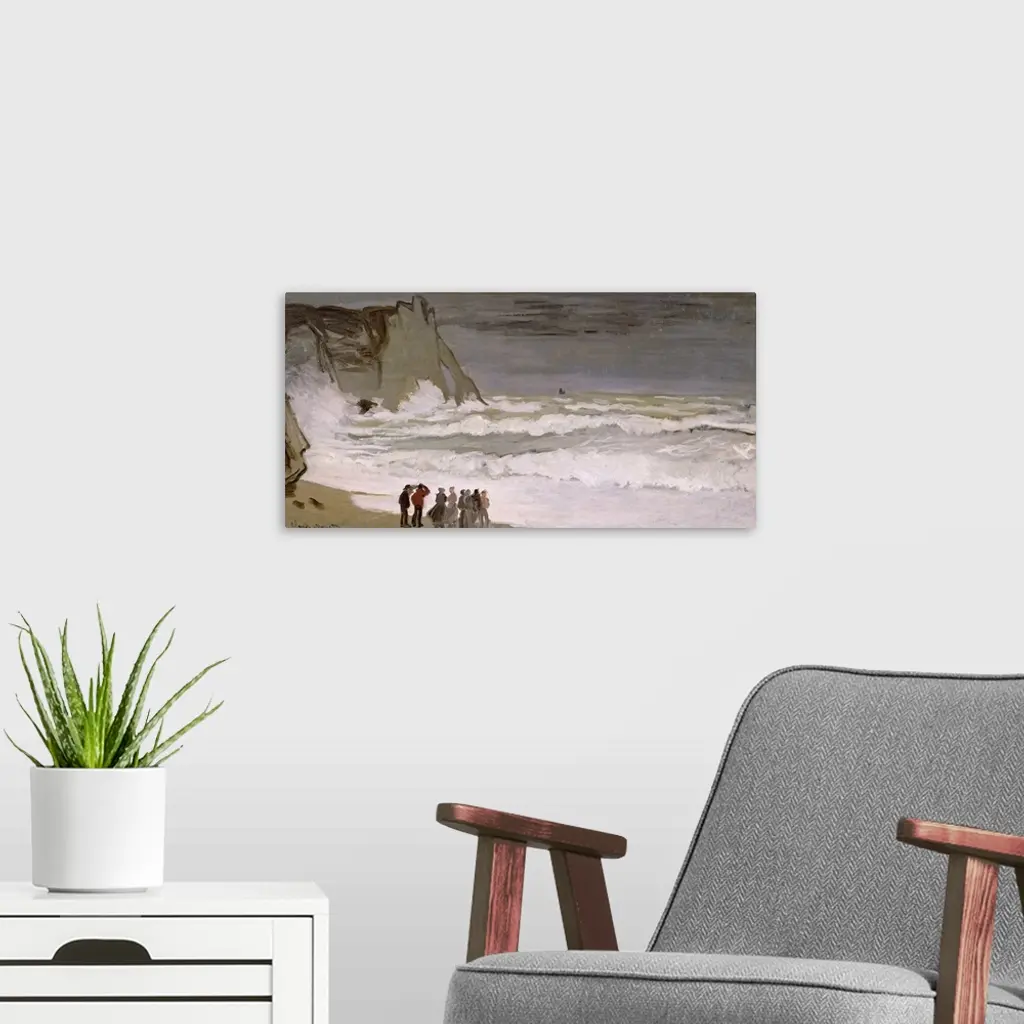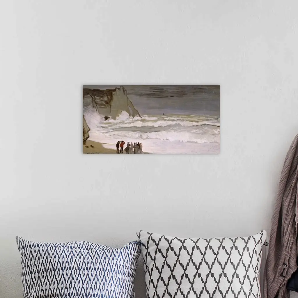 Painting of people standing at water's edge and watching the waves comes crashing in.