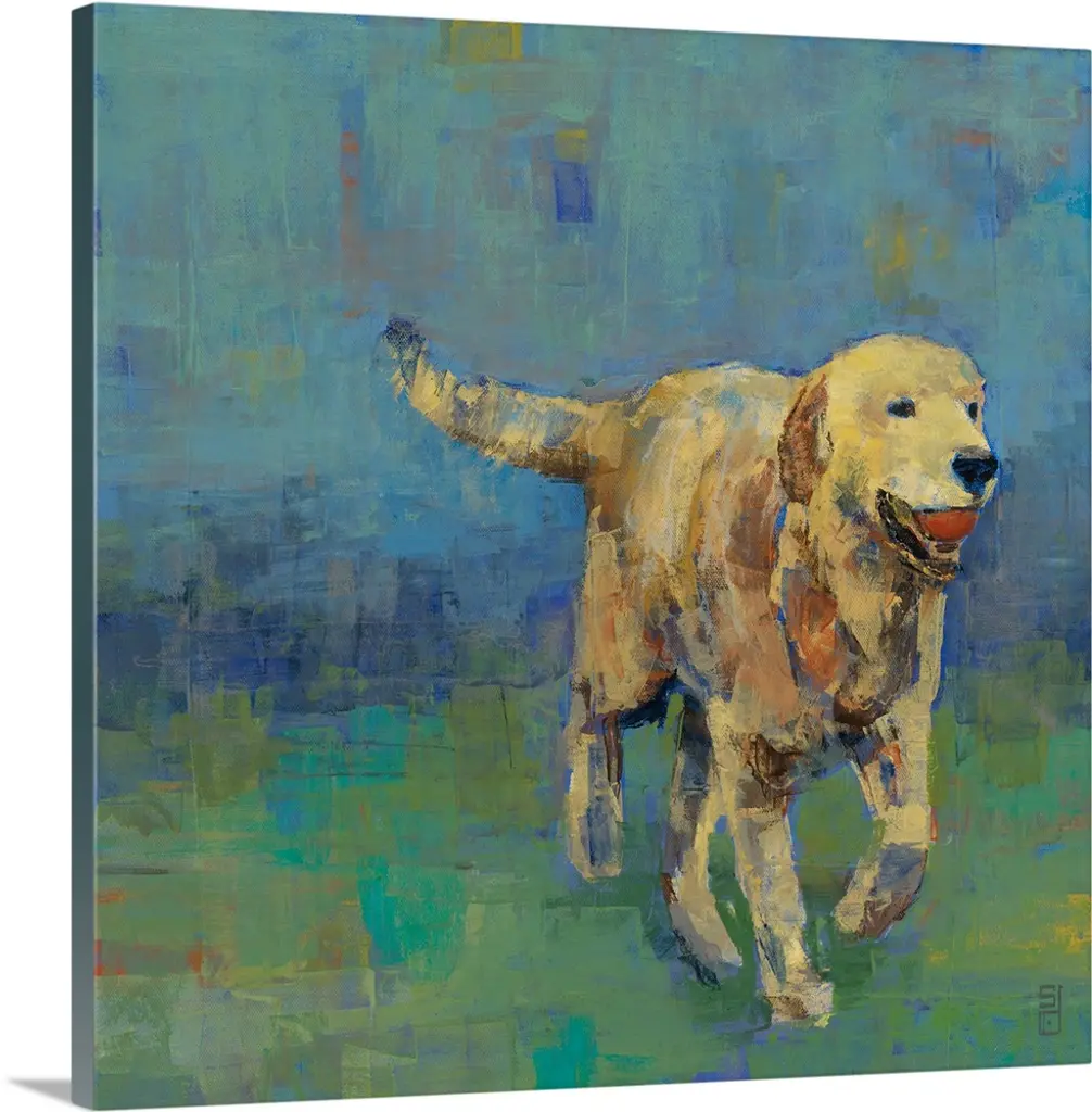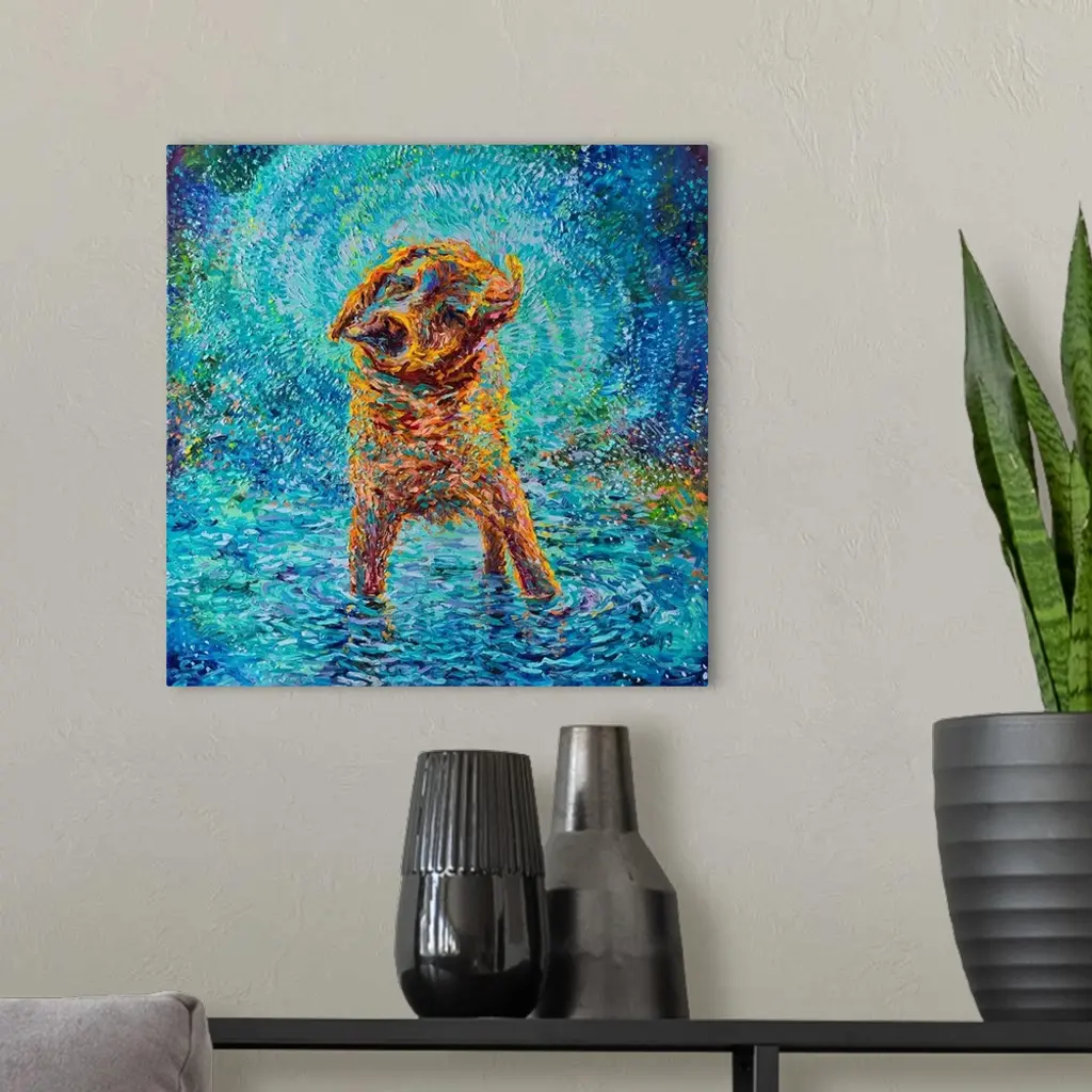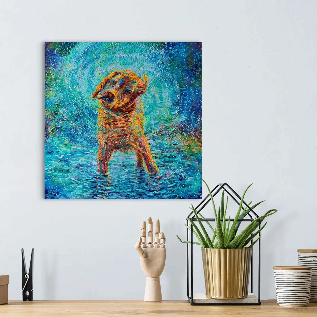 Brightly colored contemporary artwork of a dog standing in water shaking.