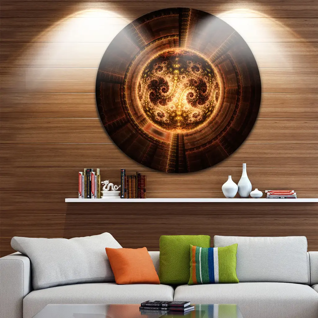 Bring Contemporary Abstraction to your home with this large Circle Metal wall art. This Rounded Orange Glowing Fractal Flower Metal Artwork makes it the focal point of any room or office. - White Gloss Coating ensures colors are extra vibrant with light reflection.- Aluminum grade Sheet Metal with 1 inch mounting frame on the back giving the illusion that the artwork is floating on the wall..- Mounting Brackets are included along with instructions.- High Quality Digital images are created directly into a glossy aluminum panel producing a stunning and captivating print into the glossy finish of the metal.- Water, Fire and Scratch resistant HD Aluminum panels.- Looks better than any photo paper and guaranteed to last at least 20 years- Easy to clean with a microfiber cloth. Colors are far superior to regular Canvas Art. - Easy to Hang