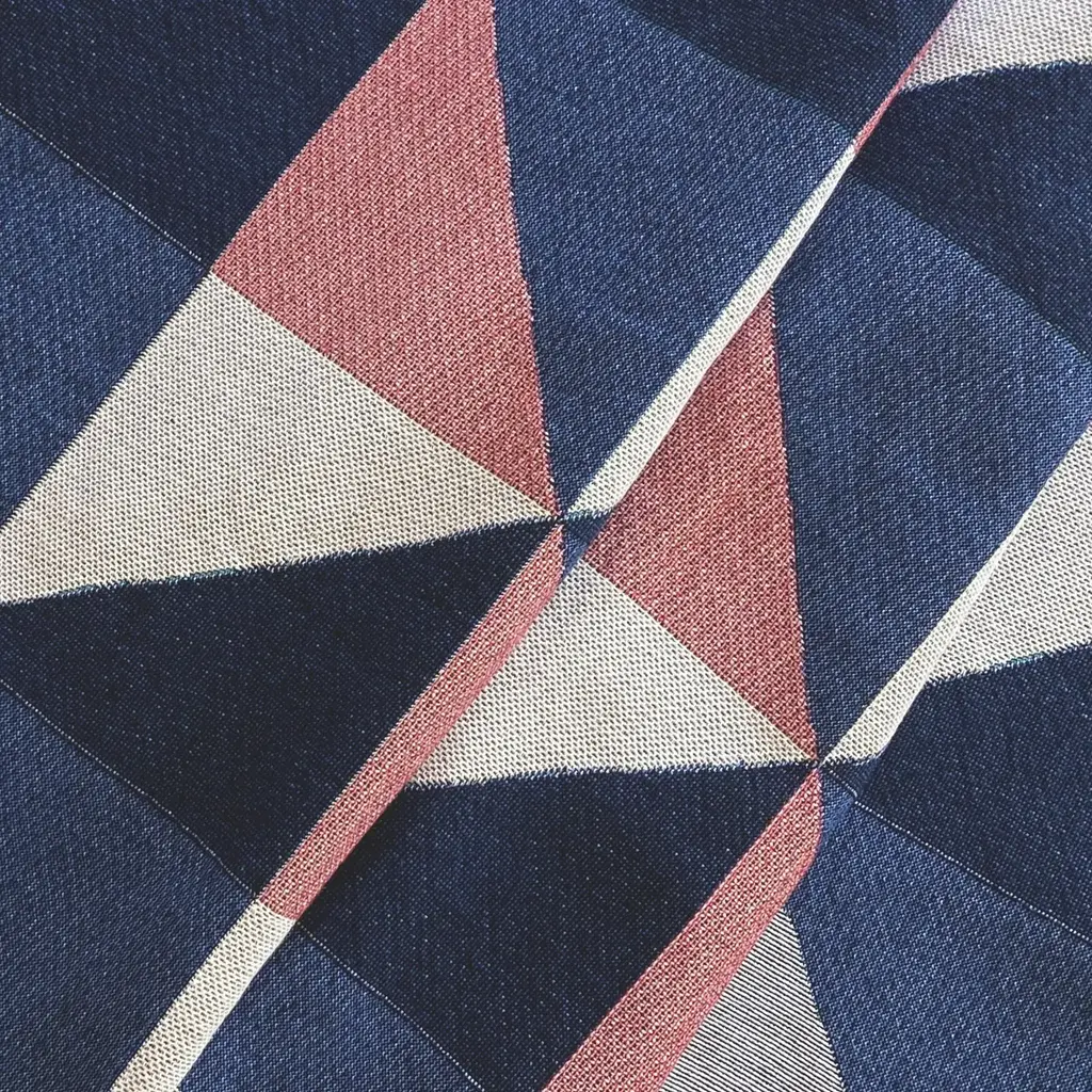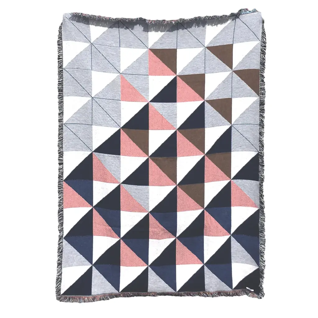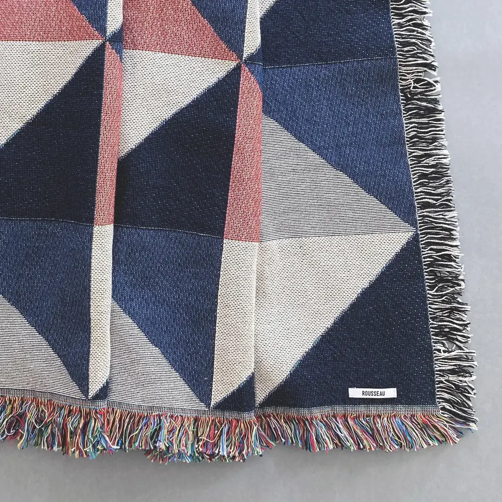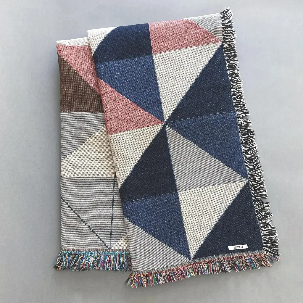ROUSSEAU is a bespoke interiors brand based in New York City. Each piece is custom produced in small batches. The Sixteen Geo throw, petite size, perfect for toddlers or kids. Gray, pink, ochre and navy geometric print woven throw with fringe edge. Woven with recycled cotton on a jacquard loom, made in the US. Each throw measures 40 x 54 inches. This geometric patterned throw is inspired by a painting we created for our New York City studio. Hand wash or machine wash cold on a delicate cycle. Line dry or machine dry on a cool cycle only.