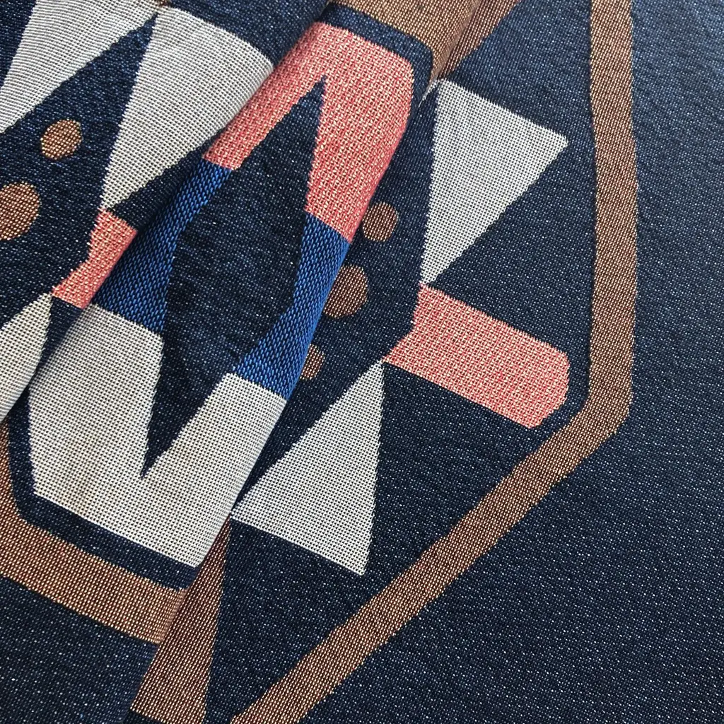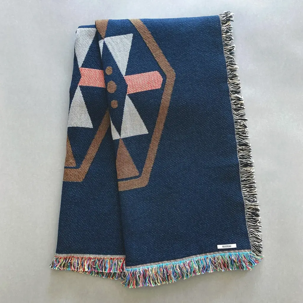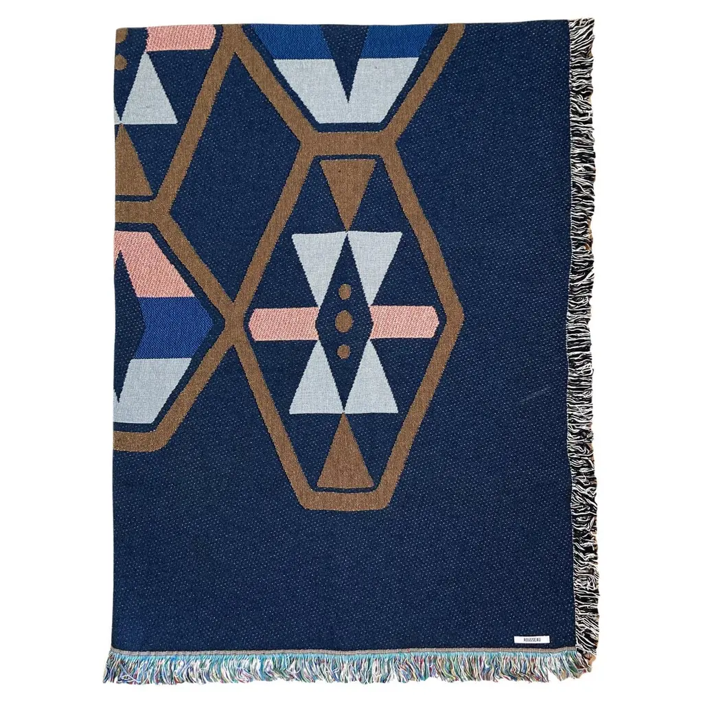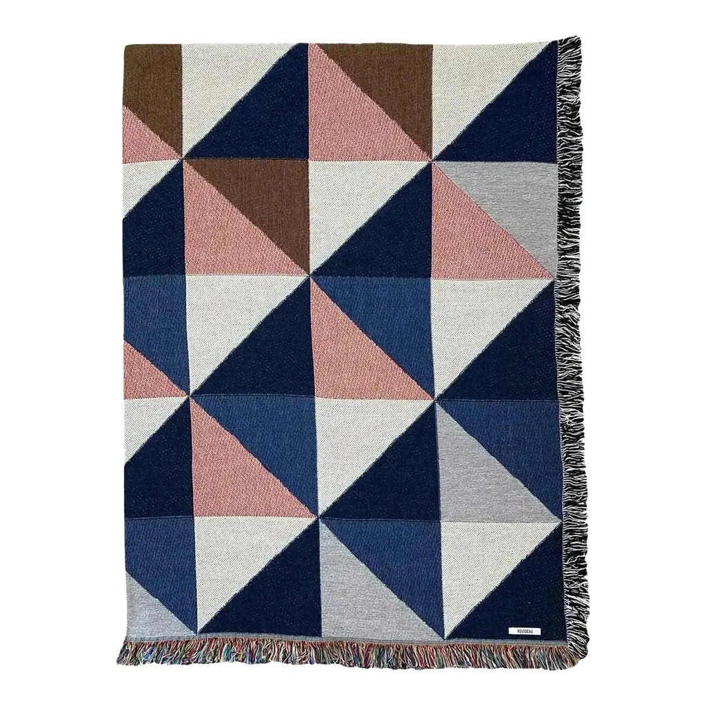 ROUSSEAU is a bespoke interiors brand based in New York City. Each piece is custom produced in small batches. The Twilight Geo throw, petite size, perfect for toddlers or kids. Gray, pink, ochre and navy geometric print woven throw with fringe edge. Woven with recycled cotton on a jacquard loom, made in the US. Each throw measures 40 x 54 inches. This geometric patterned throw is inspired by a painting we created for our New York City studio. Hand wash or machine wash cold on a delicate cycle. Line dry or machine dry on a cool cycle only.