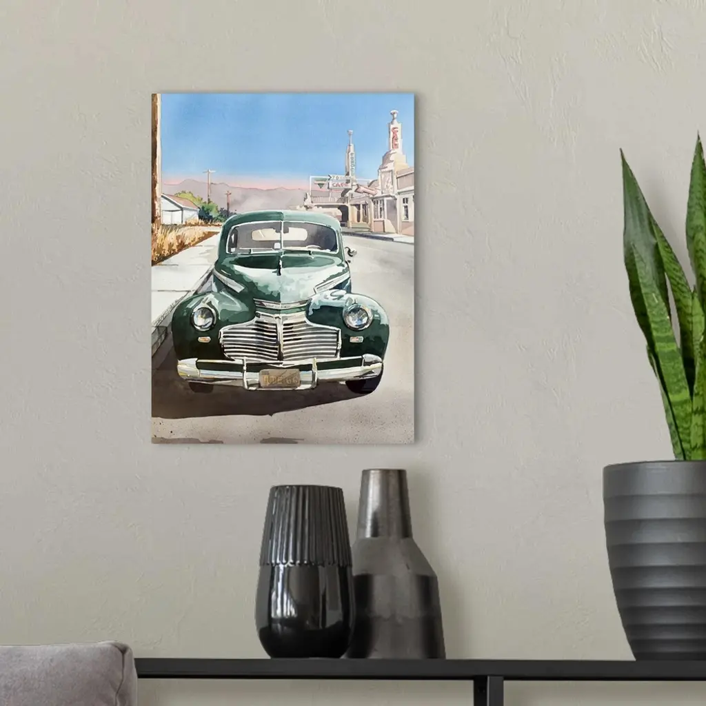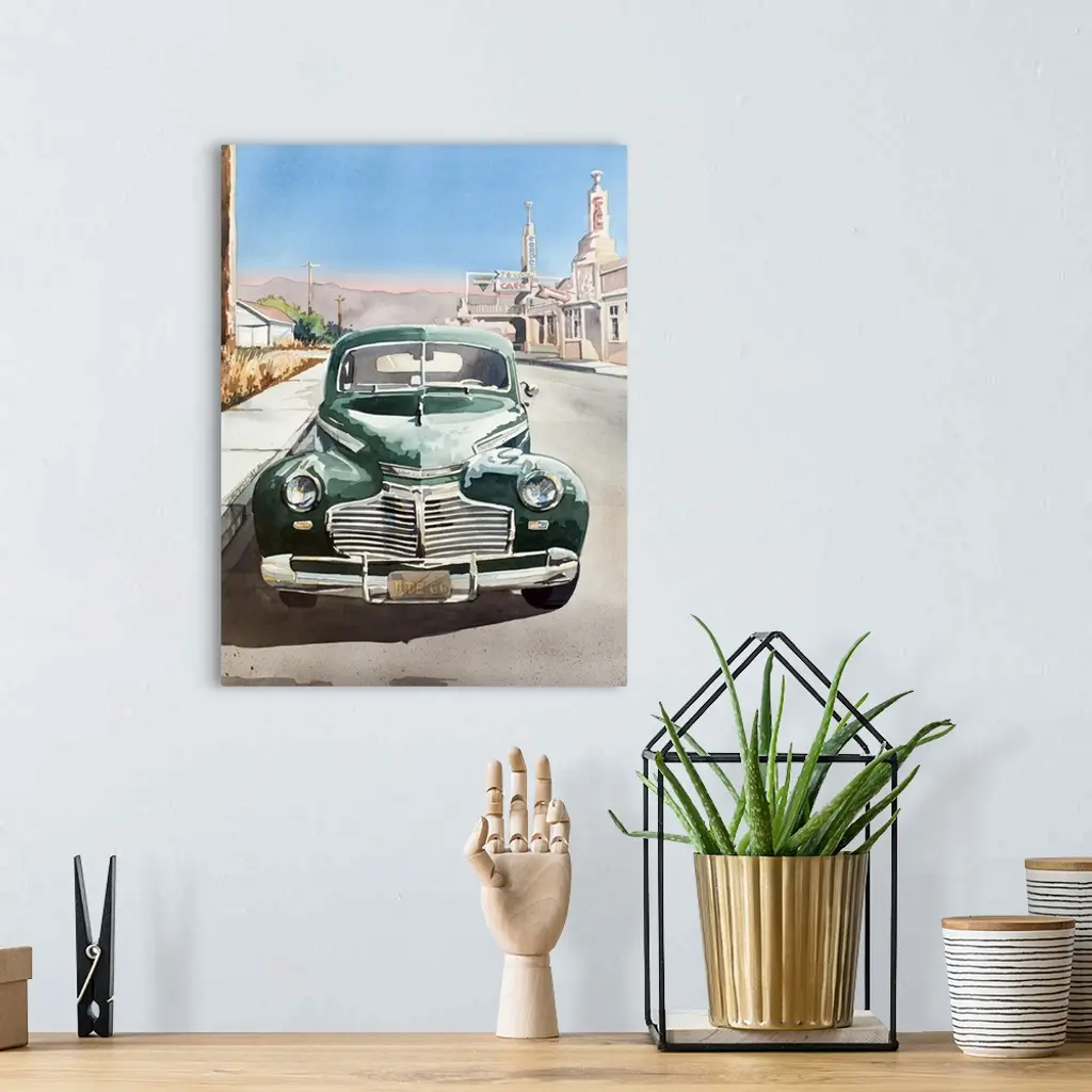 Watercolor painting of a 1941 Chevy on Route 66 in Texas.