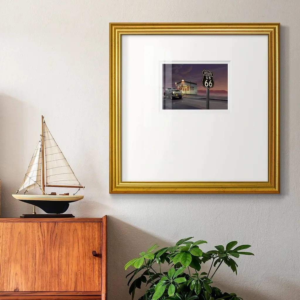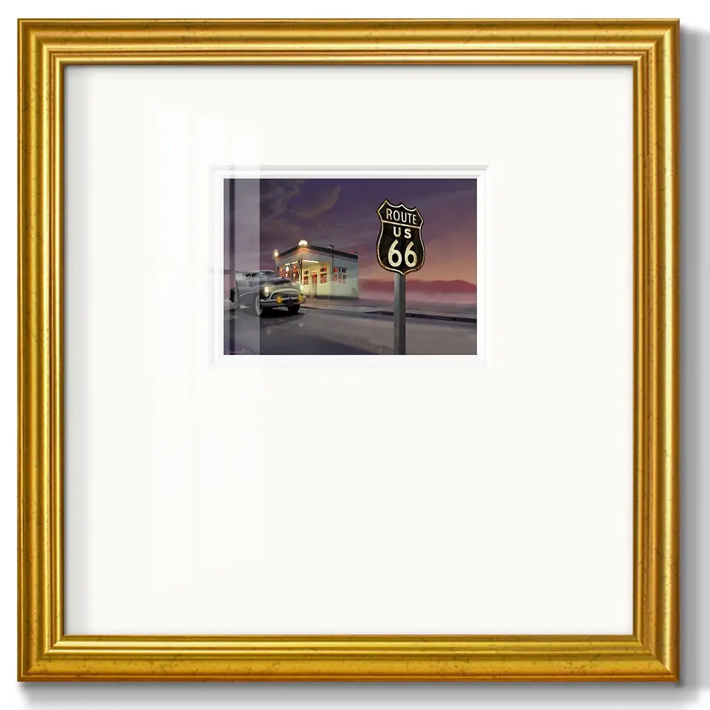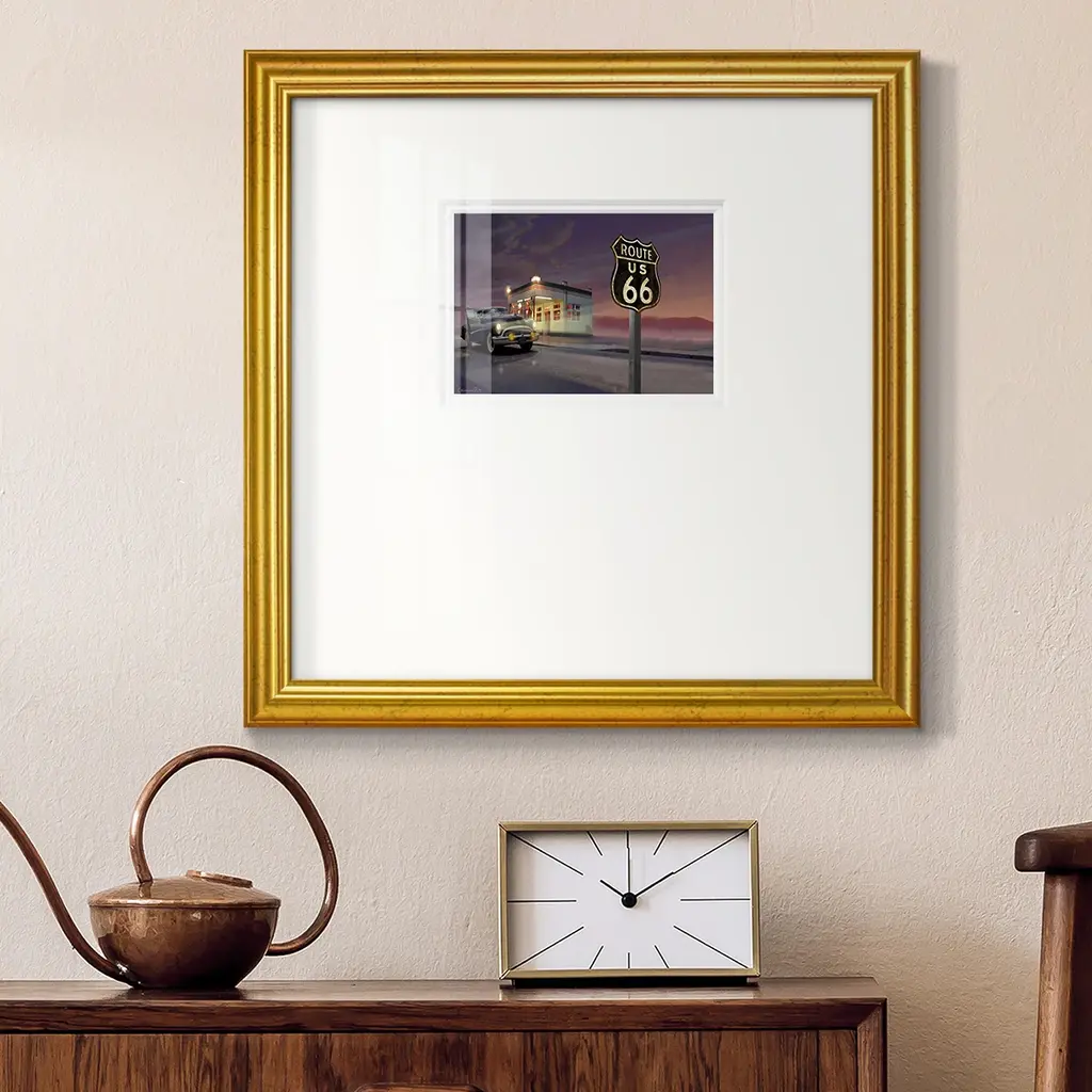 Route 66Premium Framed Print A framed cold pressed paper print featuring superior double matting and quality frame. 2 SIZES AVAILABLE 16''X16''' - Overall Size 20''X20''' - Overall Size Each piece is made to order. Each piece comes with hanging hardware. Made in the USA Ready to Hang Giclee Paper Print Plexiglass Beveled Matt Board Double Matte Board