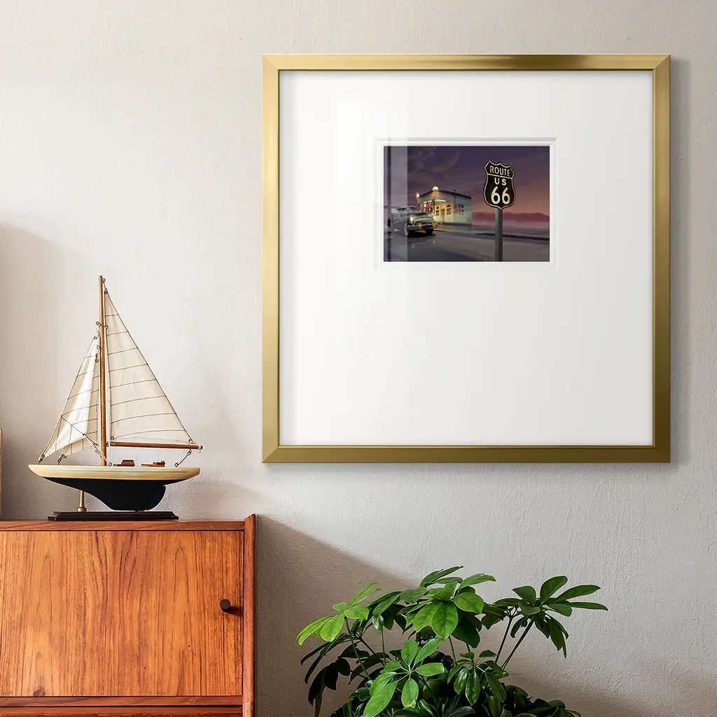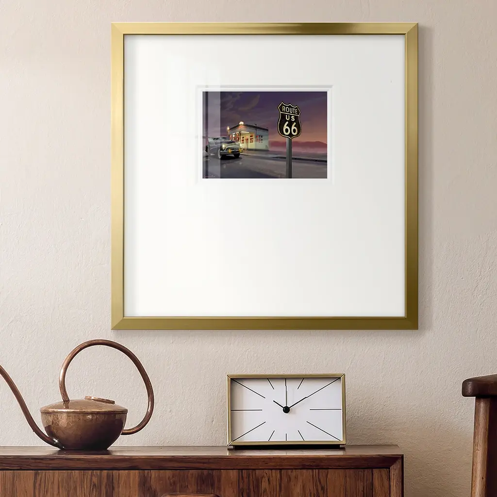 Route 66Premium Framed Print A framed cold pressed paper print featuring superior double matting and quality frame. 2 SIZES AVAILABLE 16''X16''' - Overall Size 20''X20''' - Overall Size Each piece is made to order. Each piece comes with hanging hardware. Made in the USA Ready to Hang Giclee Paper Print Plexiglass Beveled Matt Board Double Matte Board