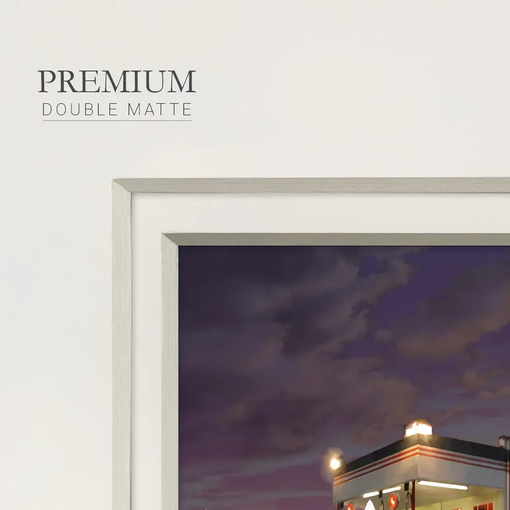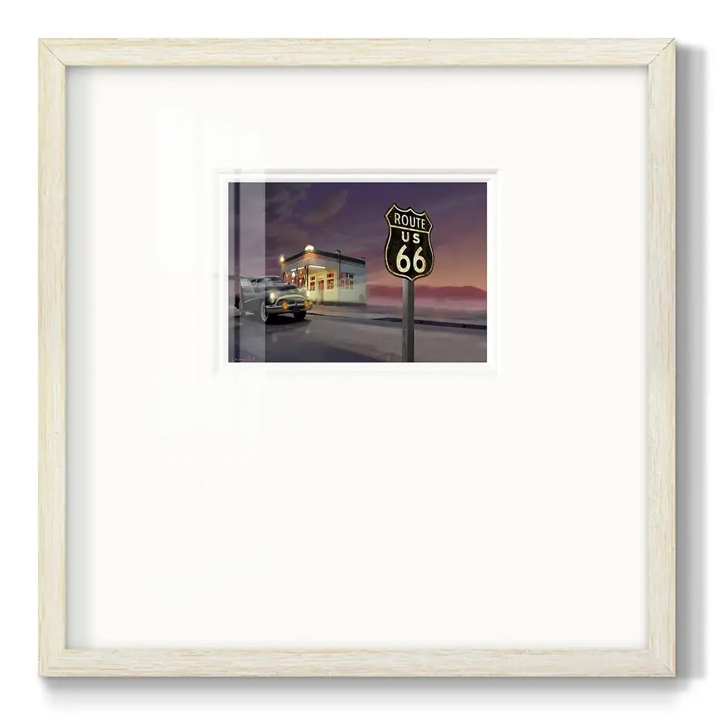 Route 66Premium Framed Print A framed cold pressed paper print featuring superior double matting and quality frame. 2 SIZES AVAILABLE 16''X16''' - Overall Size 20''X20''' - Overall Size Each piece is made to order. Each piece comes with hanging hardware. Made in the USA Ready to Hang Giclee Paper Print Plexiglass Beveled Matt Board Double Matte Board