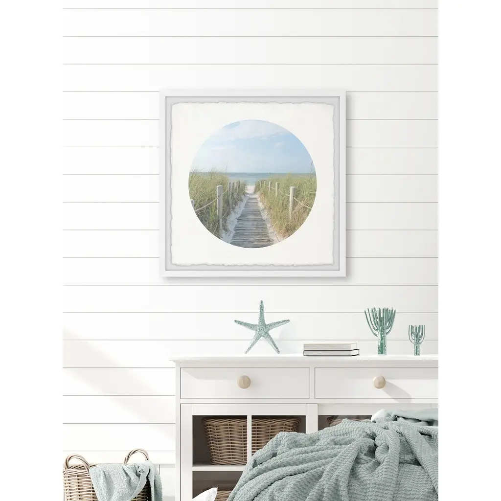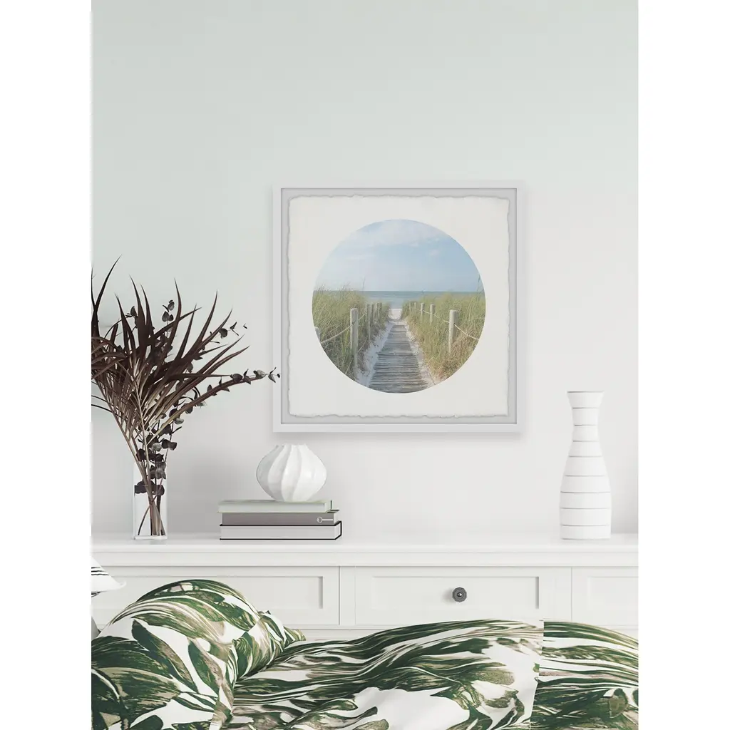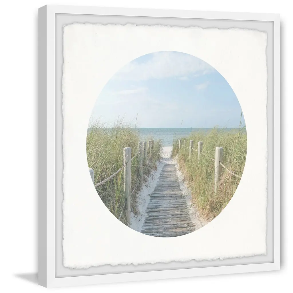 A circular photo of a worn wooden path leading down to the beach with a weathered wooden fence just barely restraining bright green and yellow grass that has grown tall and wild. The natural and rustic charm of the well walked path and the untouched green is perfect for anyone longing for something beachy. Proudly printed in the USA, this piece is printed on high quality archive paper and professionally hand-framed. With wall-mounting hooks included, this artful accent is ready to hang up as soon as it reaches your front door. • Top quality Giclee print on high resolution Archive Paper • Hand cut deckled edges • High quality durable non-warping frame • Finished under shatter resistant plexiglass • Arrives ready to hang • Includes a certificate of authenticity • Printed in the USA