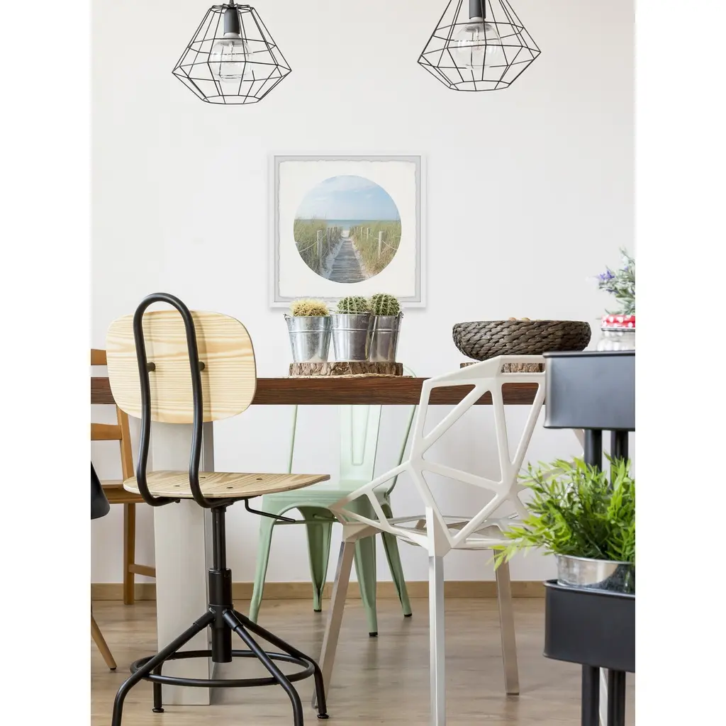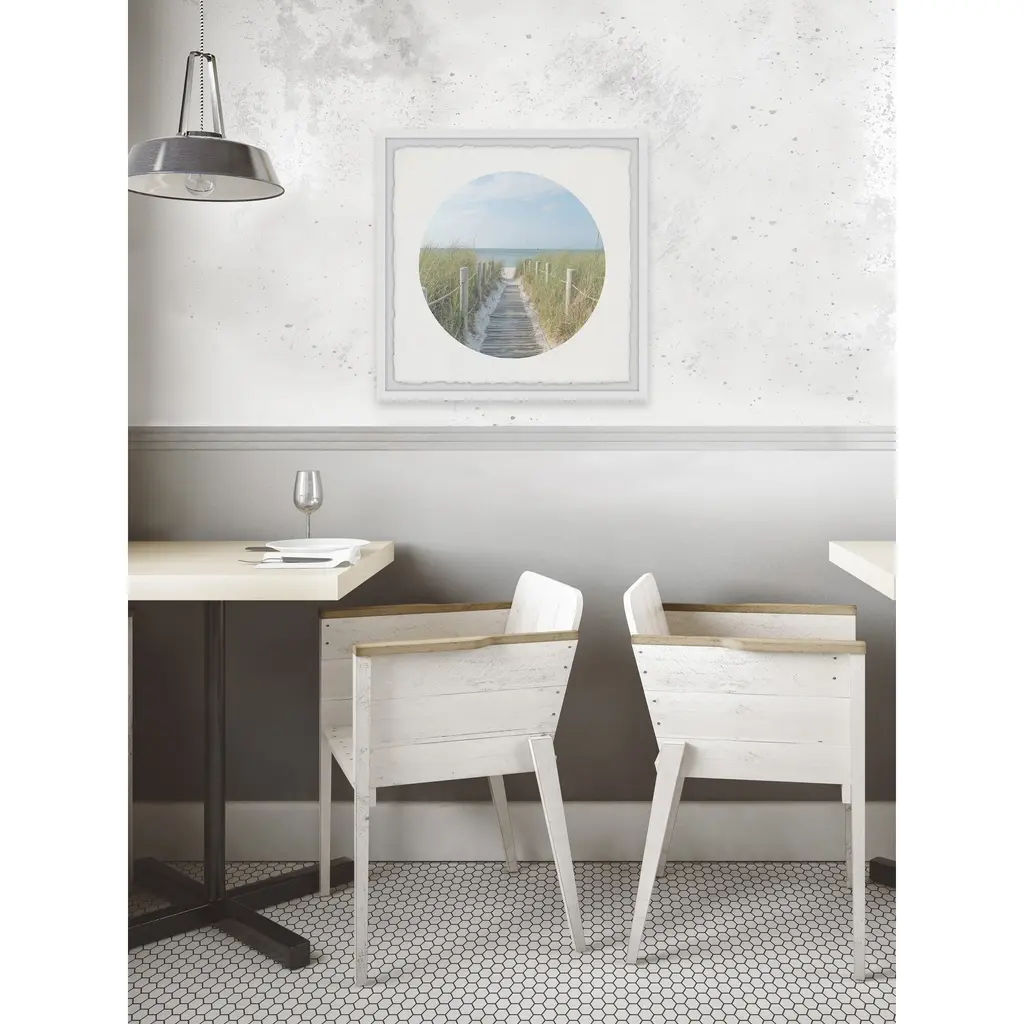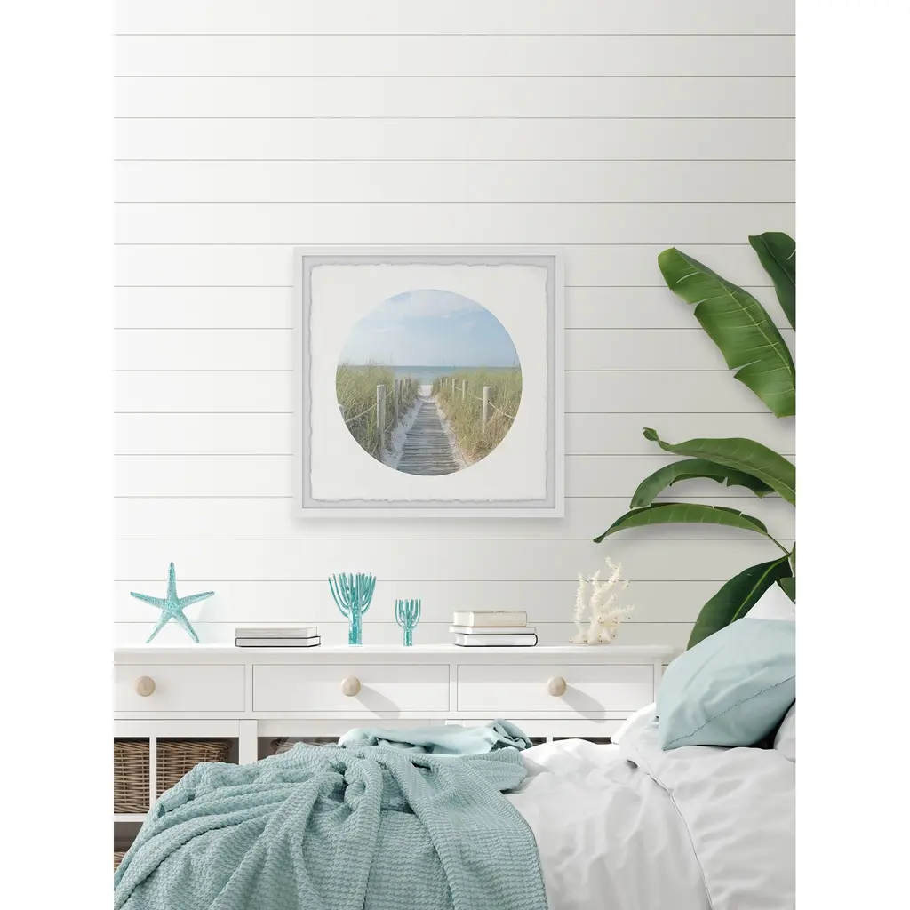 A circular photo of a worn wooden path leading down to the beach with a weathered wooden fence just barely restraining bright green and yellow grass that has grown tall and wild. The natural and rustic charm of the well walked path and the untouched green is perfect for anyone longing for something beachy. Proudly printed in the USA, this piece is printed on high quality archive paper and professionally hand-framed. With wall-mounting hooks included, this artful accent is ready to hang up as soon as it reaches your front door. • Top quality Giclee print on high resolution Archive Paper • Hand cut deckled edges • High quality durable non-warping frame • Finished under shatter resistant plexiglass • Arrives ready to hang • Includes a certificate of authenticity • Printed in the USA