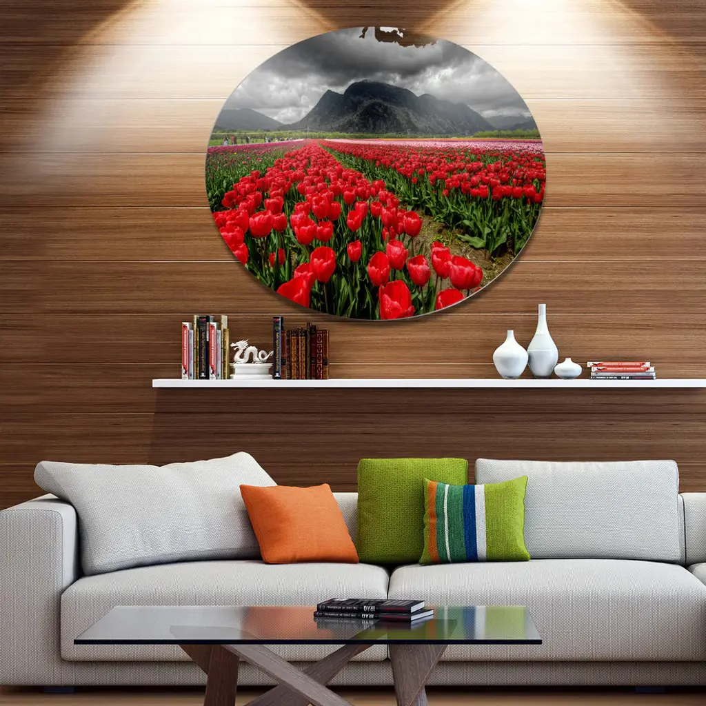 Bring Contemporary Abstraction to your home with this large Circle Metal wall art. This Rows of Bright Ruby Red Tulips Metal Artwork makes it the focal point of any room or office. - White Gloss Coating ensures colors are extra vibrant with light reflection.- Aluminum grade Sheet Metal with 1 inch mounting frame on the back giving the illusion that the artwork is floating on the wall..- Mounting Brackets are included along with instructions.- High Quality Digital images are created directly into a glossy aluminum panel producing a stunning and captivating print into the glossy finish of the metal.- Water, Fire and Scratch resistant HD Aluminum panels.- Looks better than any photo paper and guaranteed to last at least 20 years- Easy to clean with a microfiber cloth. Colors are far superior to regular Canvas Art. - Easy to Hang