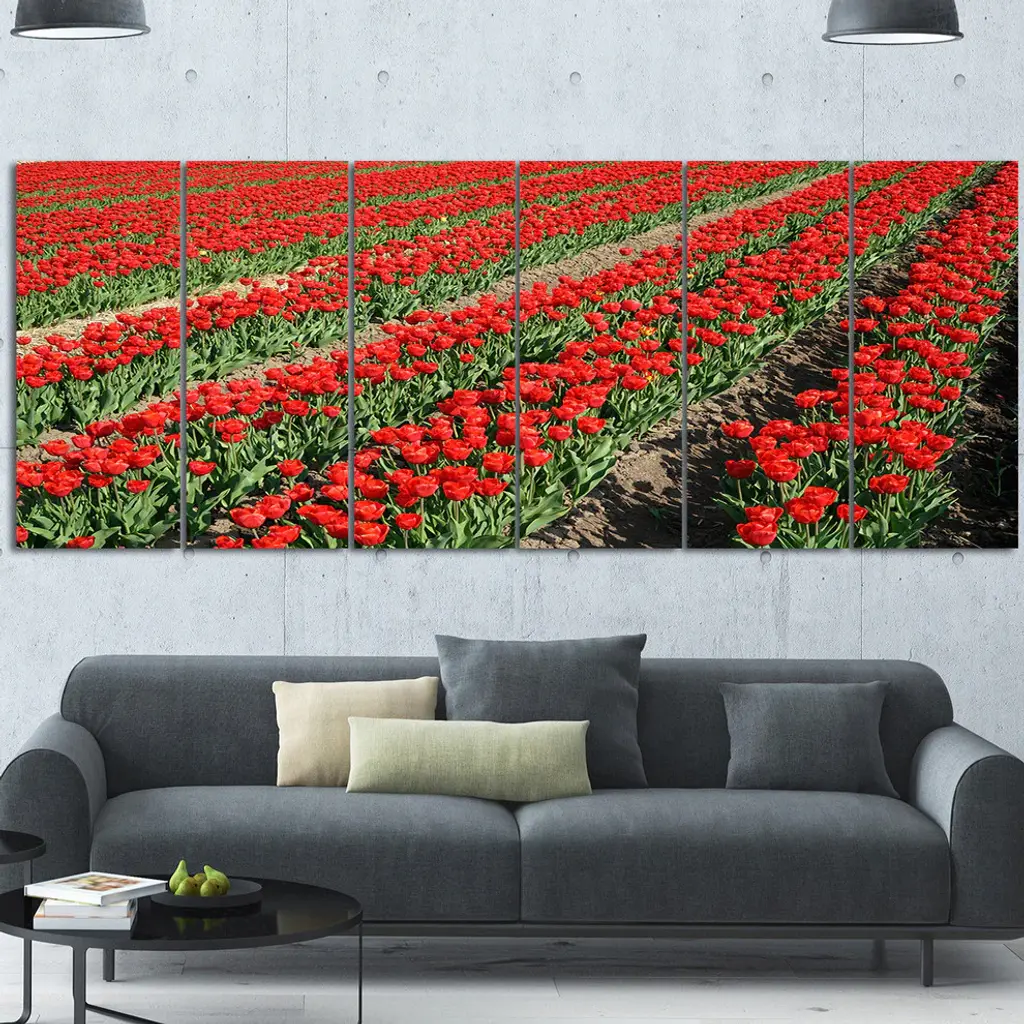 Rows Of Red Tulip Flowers, Metal Art, 70x28, 6 Panels