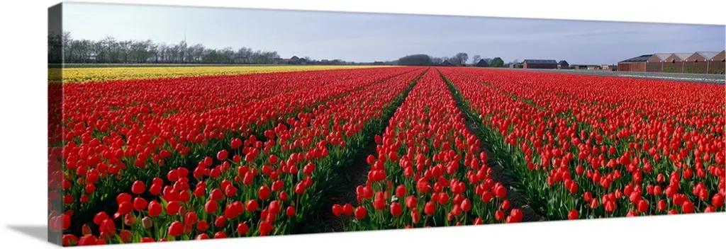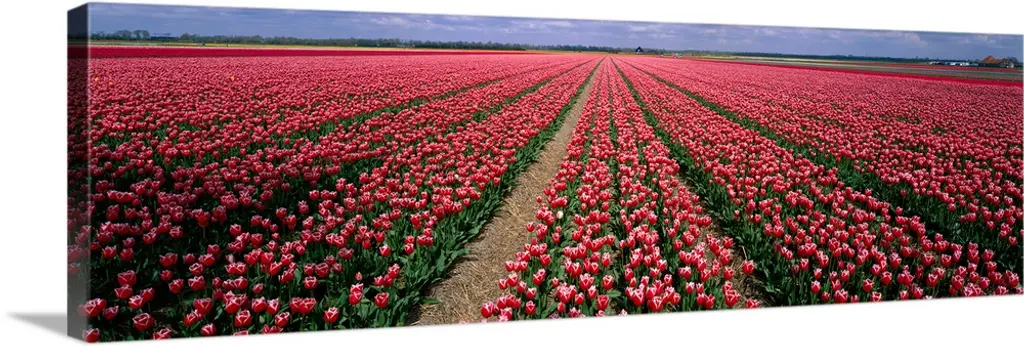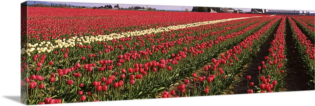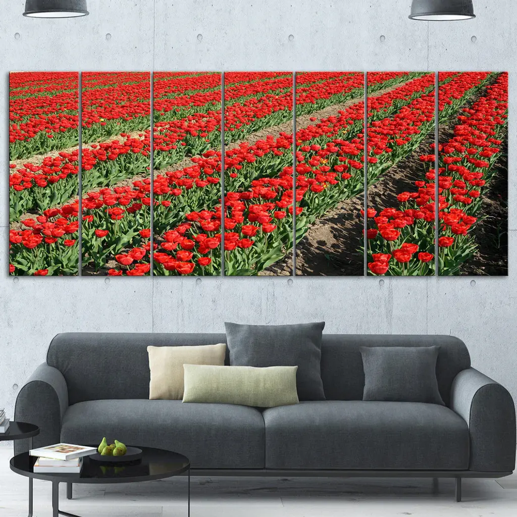 Bring Contemporary Abstraction to your home with this large 83W X 32H Metal wall art. This Rows of Red Tulip Flowers Metal Artwork makes it the focal point of any room or office. - White Gloss Coating ensures colors are extra vibrant with light reflection.- Aluminum grade Sheet Metal with 1 inch mounting frame on the back giving the illusion that the artwork is floating on the wall..- Mounting Brackets are included along with instructions.- High Quality Digital images are created directly into a glossy aluminum panel producing a stunning and captivating print into the glossy finish of the metal.- Water, Fire and Scratch resistant HD Aluminum panels.- Looks better than any photo paper and guaranteed to last at least 20 years- Easy to clean with a microfiber cloth. Colors are far superior to regular Canvas Art. - Easy to Hang
