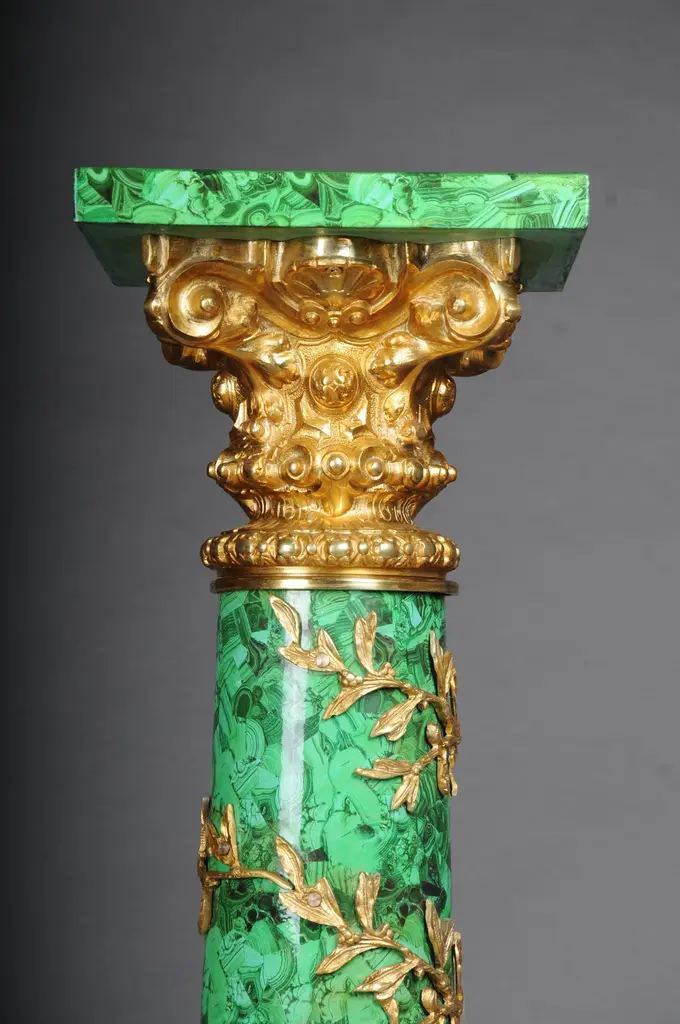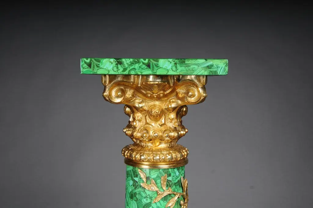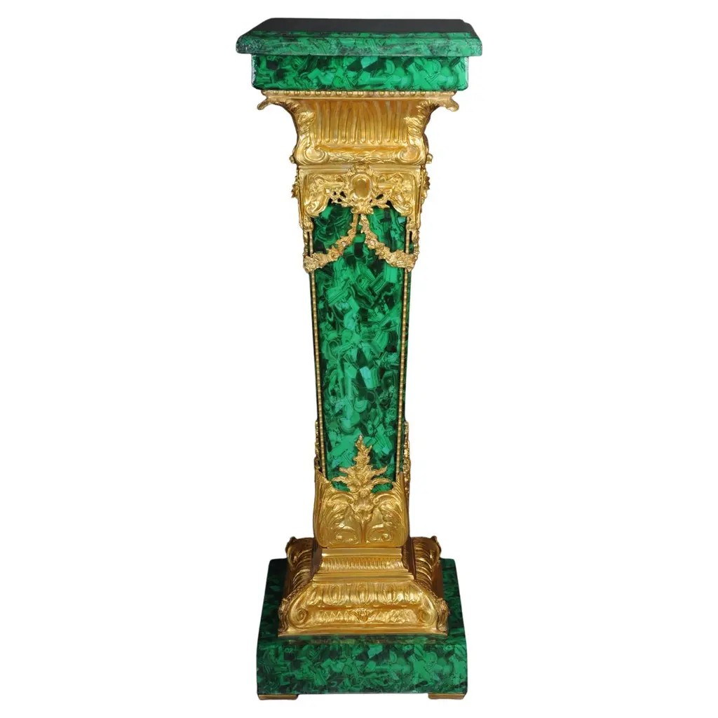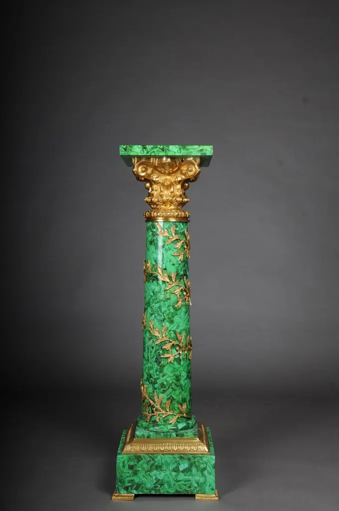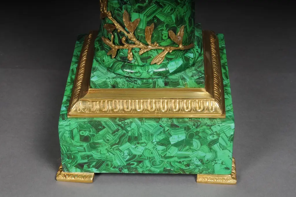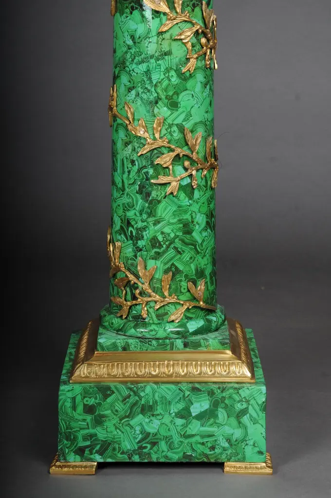 Royal Empire column with malachite and gilt bronzeImpressive and regal wooden column with bronze mounts in Empire style. Solid wood coated with malachite painting technique. Such a column is guaranteed to be a real eye-catcher and something very special.Malachite marbling may vary slightly.