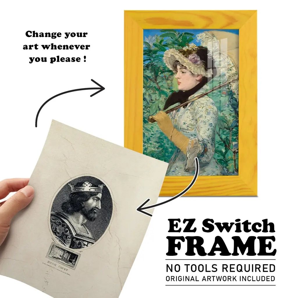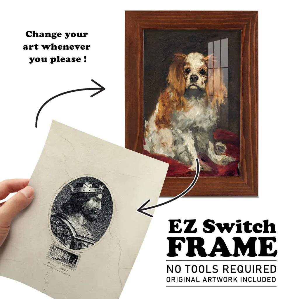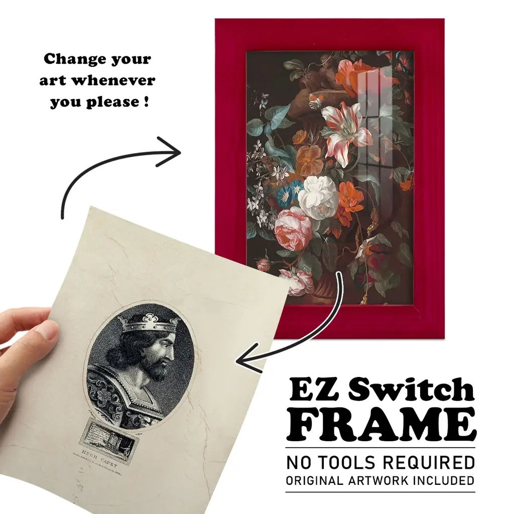 Royal Portraits II -EZ SWITCH Framed Print w/glass-Cherry Red A delightful, framed print. Featuring a solid wood frame with real wood glass. This premium print is giclee quality. In addition, every frame features a removable back and table top stand. This allows you to change your art in the future or to just stand the art on a table for a new look. We are sure you'll enjoy our new series of EZ SWITCH Framed Art. Solid Wood Frame Real Glass Removable / Replaceable Art Built in Tabletop Stand Sizes range from 4x6 up to 12x15 - buy just one or pair them up as sets as you see fit.