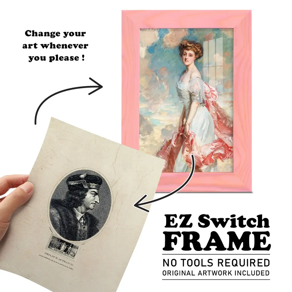 Royal Portraits IV -EZ SWITCH Framed Print w/glass-Cherry Red A delightful, framed print. Featuring a solid wood frame with real wood glass. This premium print is giclee quality. In addition, every frame features a removable back and table top stand. This allows you to change your art in the future or to just stand the art on a table for a new look. We are sure you'll enjoy our new series of EZ SWITCH Framed Art. Solid Wood Frame Real Glass Removable / Replaceable Art Built in Tabletop Stand Sizes range from 4x6 up to 12x15 - buy just one or pair them up as sets as you see fit.