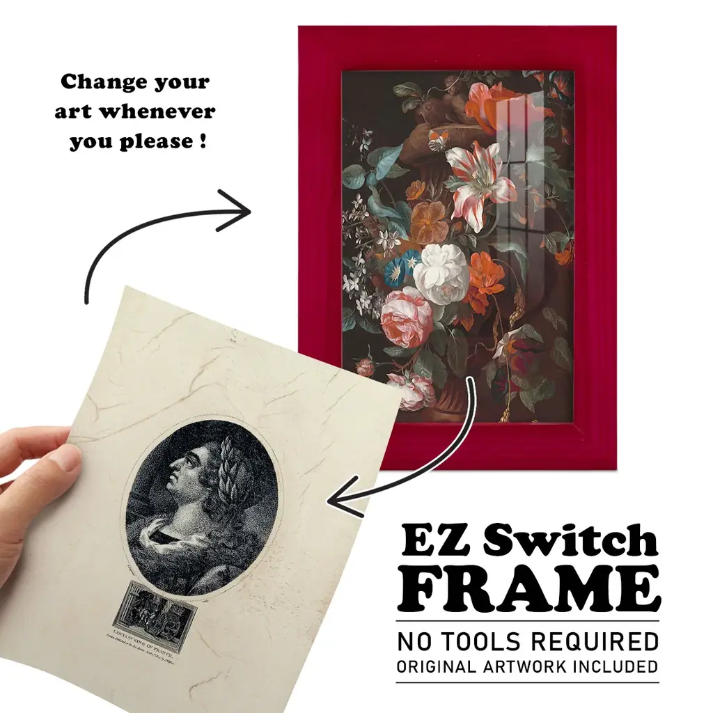Royal Portraits IX -EZ SWITCH Framed Print w/glass-Cherry Red A delightful, framed print. Featuring a solid wood frame with real wood glass. This premium print is giclee quality. In addition, every frame features a removable back and table top stand. This allows you to change your art in the future or to just stand the art on a table for a new look. We are sure you'll enjoy our new series of EZ SWITCH Framed Art. Solid Wood Frame Real Glass Removable / Replaceable Art Built in Tabletop Stand Sizes range from 4x6 up to 12x15 - buy just one or pair them up as sets as you see fit.