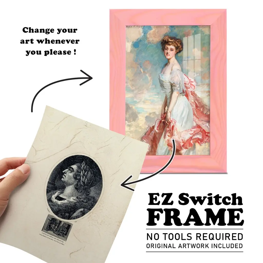 Royal Portraits IX -EZ SWITCH Framed Print w/glass-Cherry Red A delightful, framed print. Featuring a solid wood frame with real wood glass. This premium print is giclee quality. In addition, every frame features a removable back and table top stand. This allows you to change your art in the future or to just stand the art on a table for a new look. We are sure you'll enjoy our new series of EZ SWITCH Framed Art. Solid Wood Frame Real Glass Removable / Replaceable Art Built in Tabletop Stand Sizes range from 4x6 up to 12x15 - buy just one or pair them up as sets as you see fit.