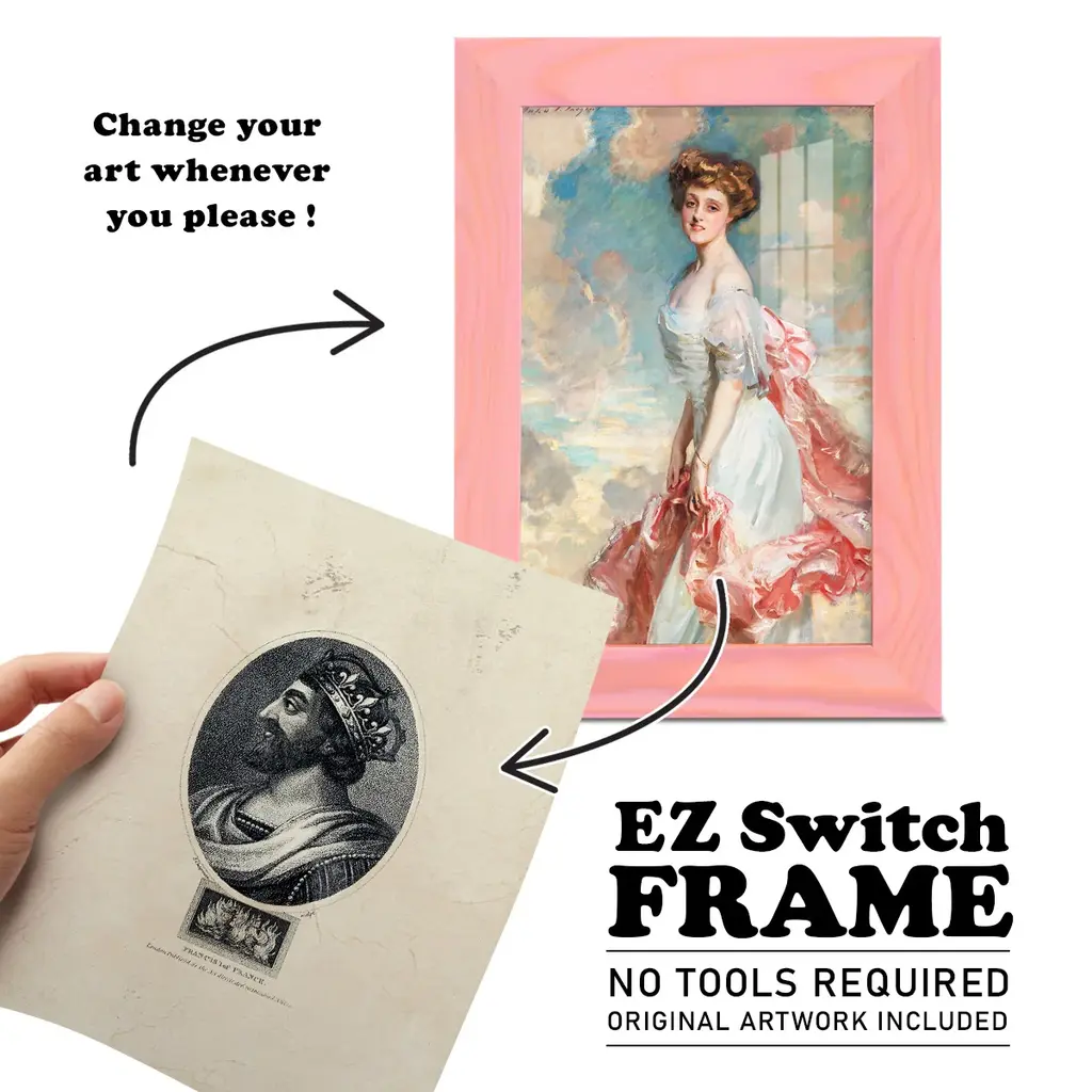 Royal Portraits VI -EZ SWITCH Framed Print w/glass-Cherry Red A delightful, framed print. Featuring a solid wood frame with real wood glass. This premium print is giclee quality. In addition, every frame features a removable back and table top stand. This allows you to change your art in the future or to just stand the art on a table for a new look. We are sure you'll enjoy our new series of EZ SWITCH Framed Art. Solid Wood Frame Real Glass Removable / Replaceable Art Built in Tabletop Stand Sizes range from 4x6 up to 12x15 - buy just one or pair them up as sets as you see fit.